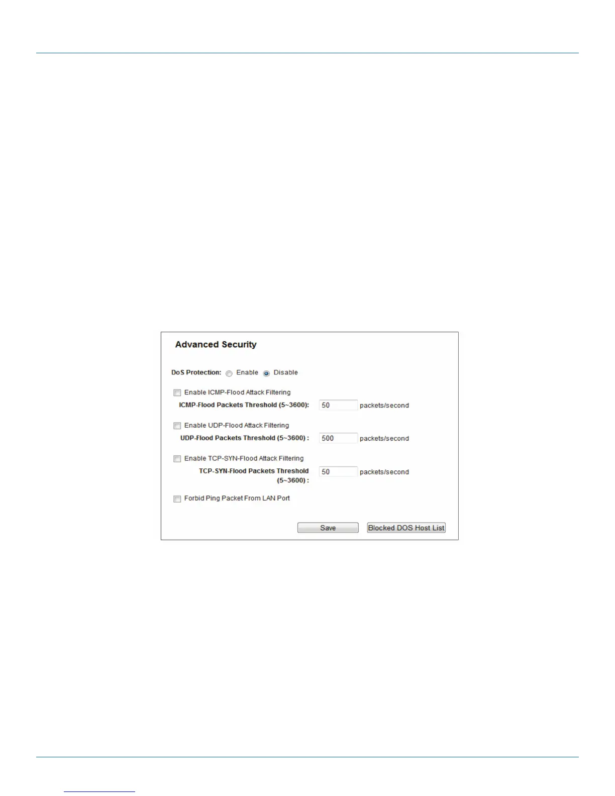 • DoS Protection—Denial of Service protection. Check the Enable or Disable button to enable or disable the DoS protection