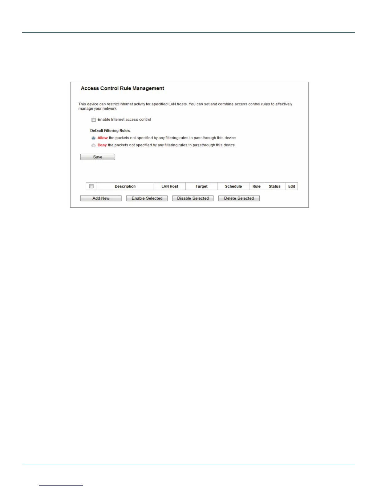 • Enable Internet Access Control—Select the check box to enable the Internet Access Control function, so the Default Filter Policy
