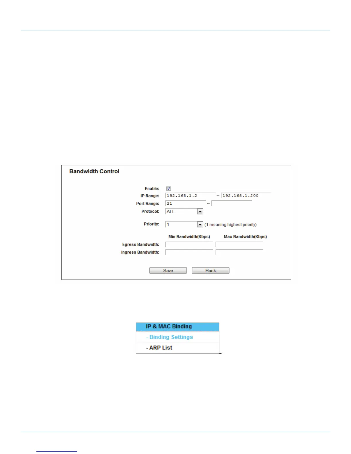 There are two submenus under the IP & MAC Binding menu: Binding Settings and ARP List. Click either of them, and you will be