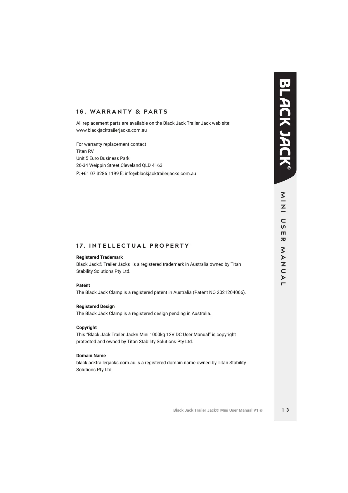 This “Black Jack Trailer Jack® Mini 1000kg 12V DC User Manual” is copyright