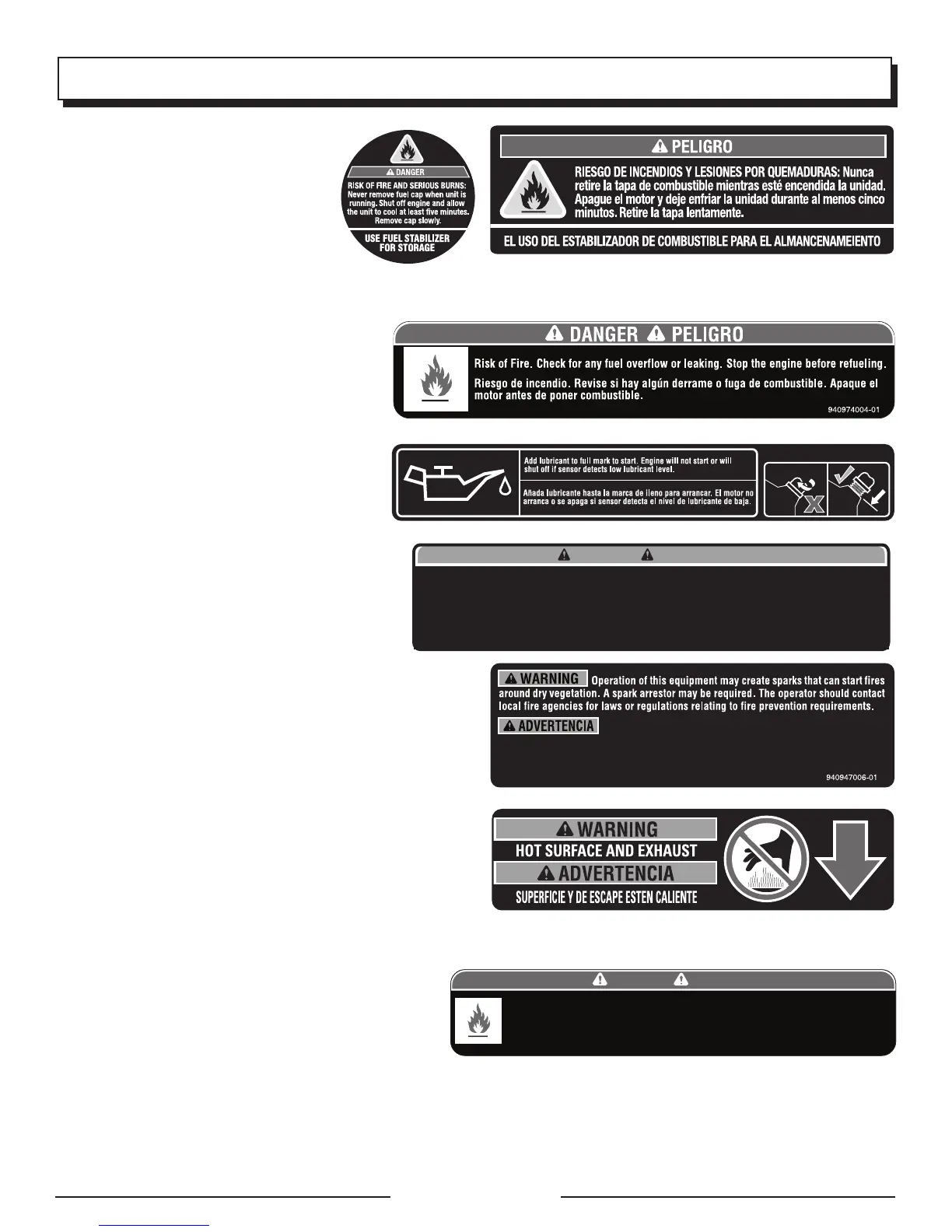 Risk of Fire. Keep all objects at least 3 feet away from this machine. Heat from Muffler and Exhaust gases