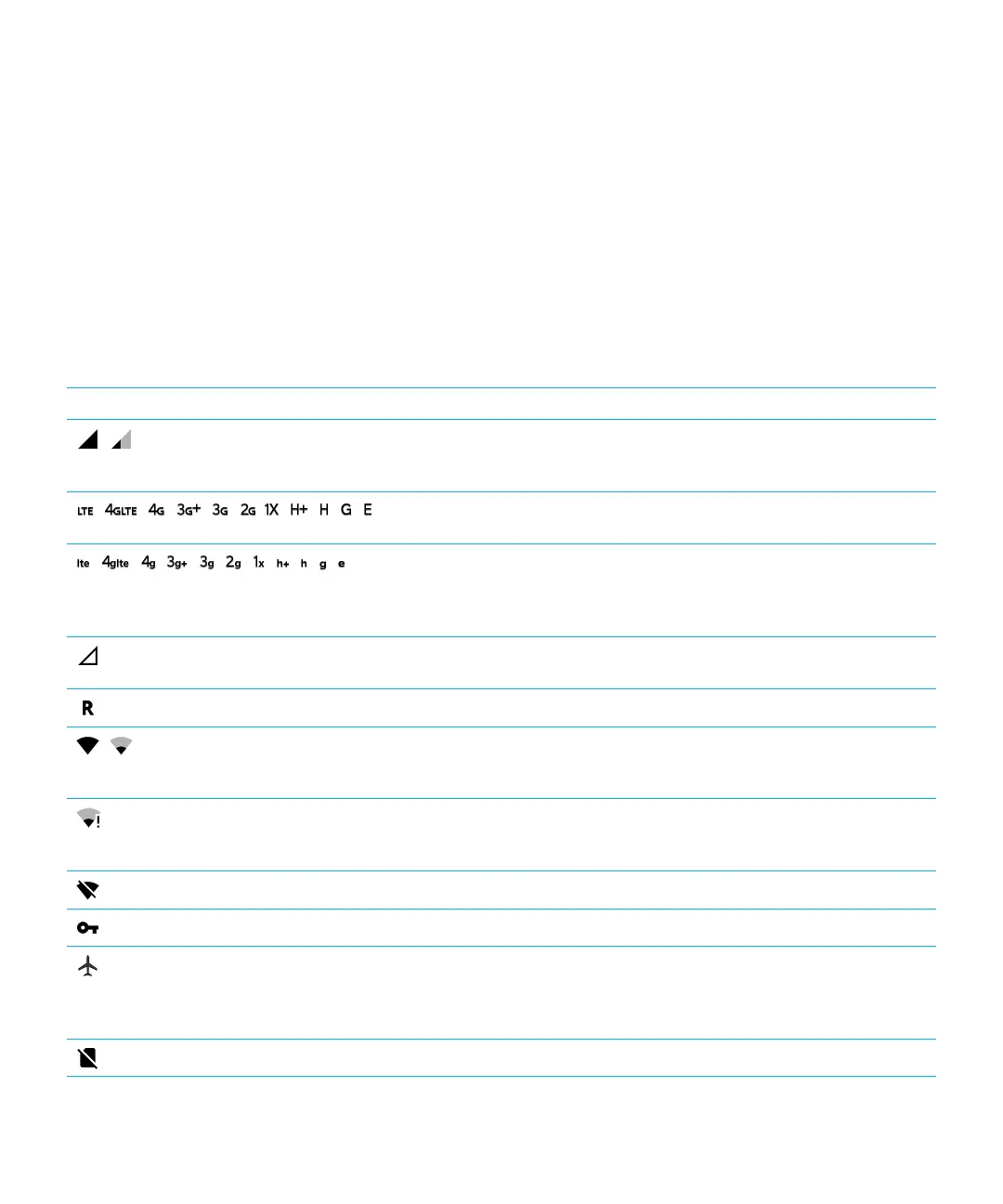The following icons might appear at the top of your screen to indicate the wireless coverage level that your device currently