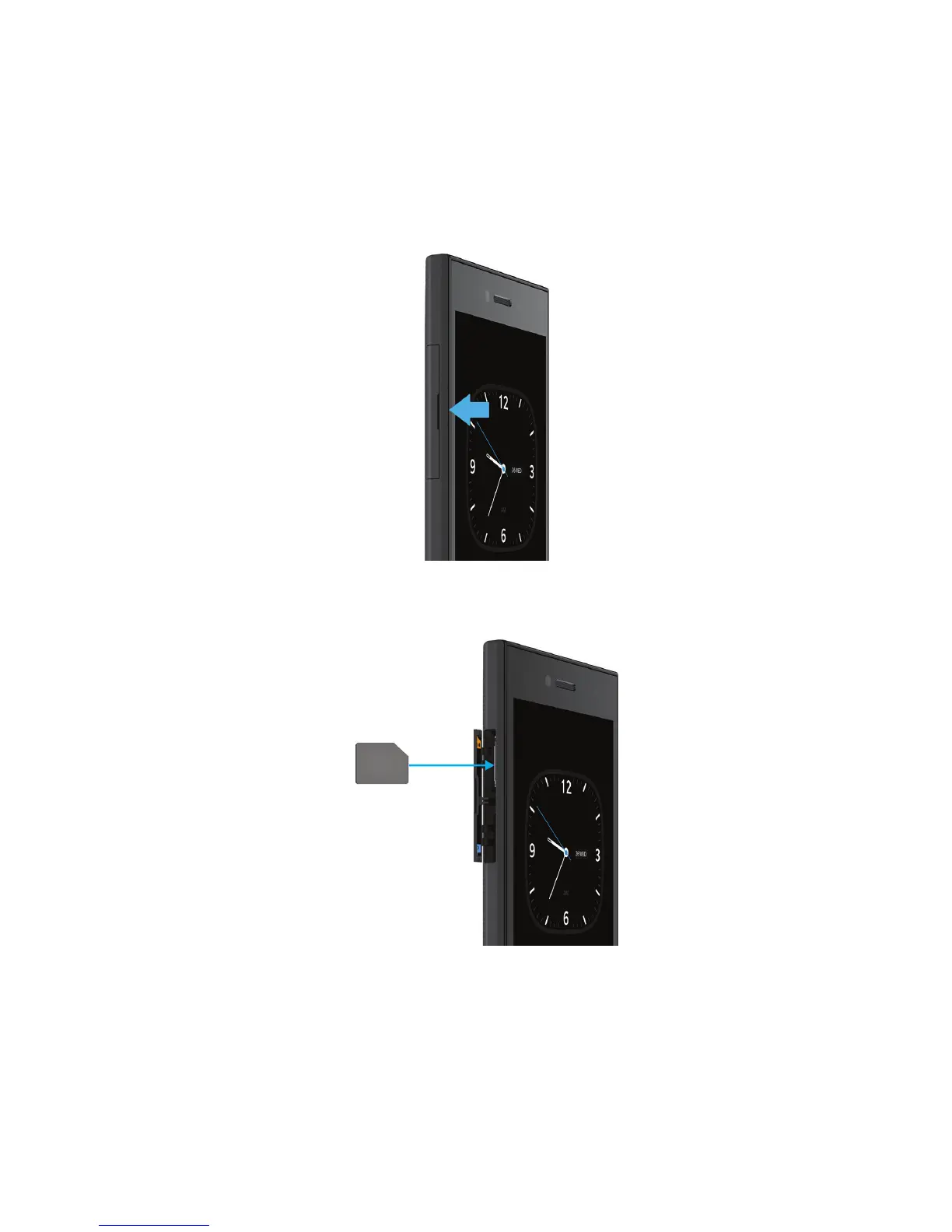 With the metal contacts facing away from you, insert the micro SIM card into the top slot as shown.