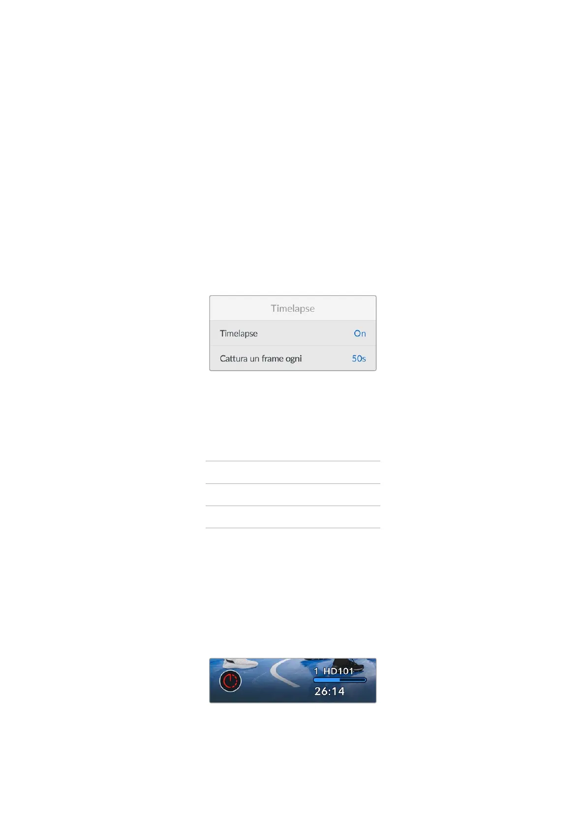Con la funzione Timelapse accesa, registra automaticamente un fotogramma nei seguenti