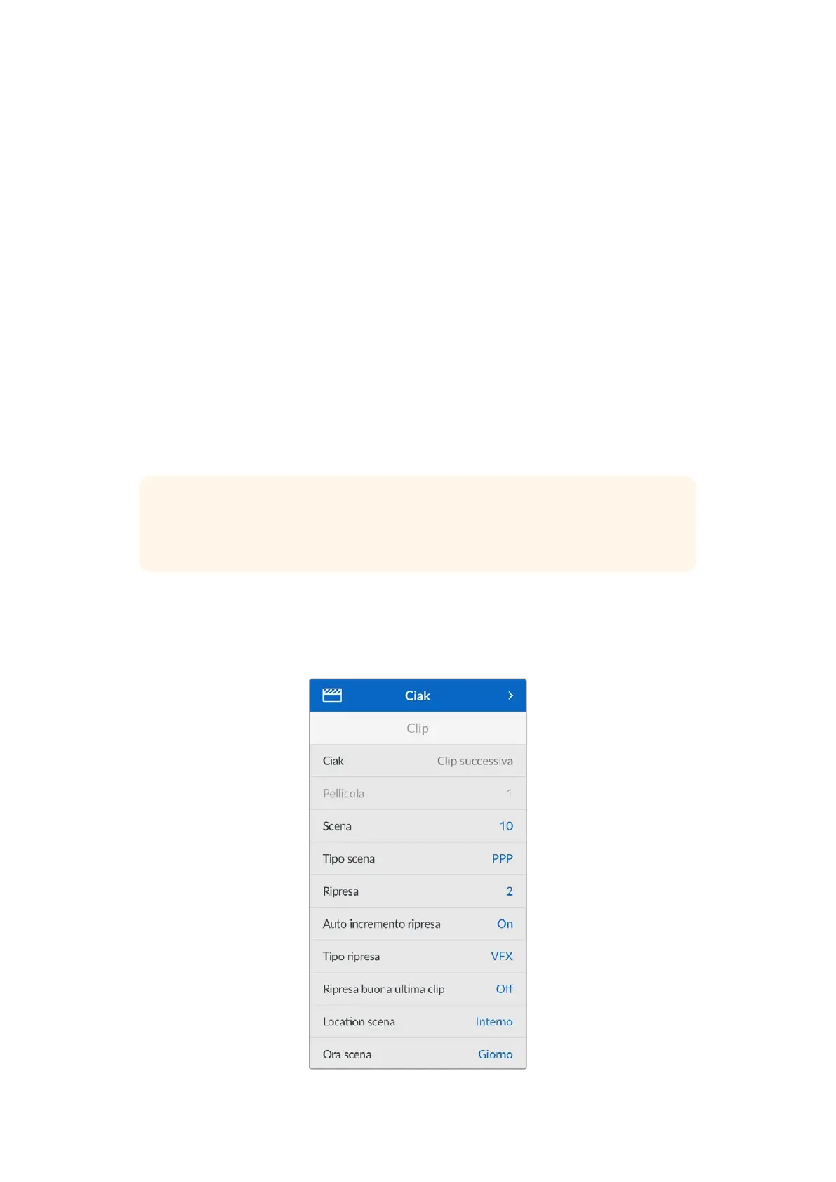 le impostazioni della camera, il timecode, la data e l’ora. Utilizza il ciak digitale per inserire