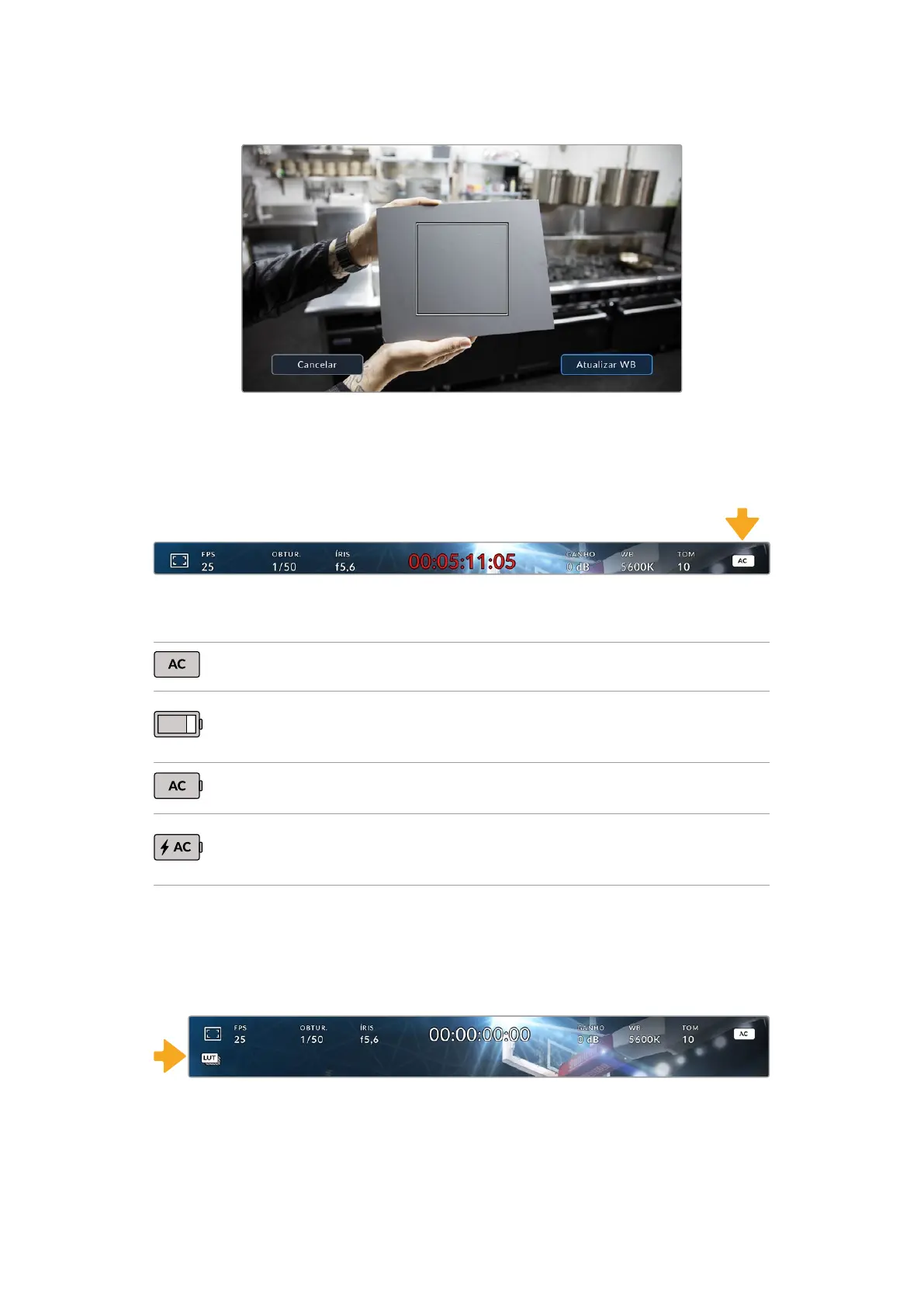 Ao usar uma LUT como ferramenta de pré-visualização no set, um ícone de LUT branco será exibido