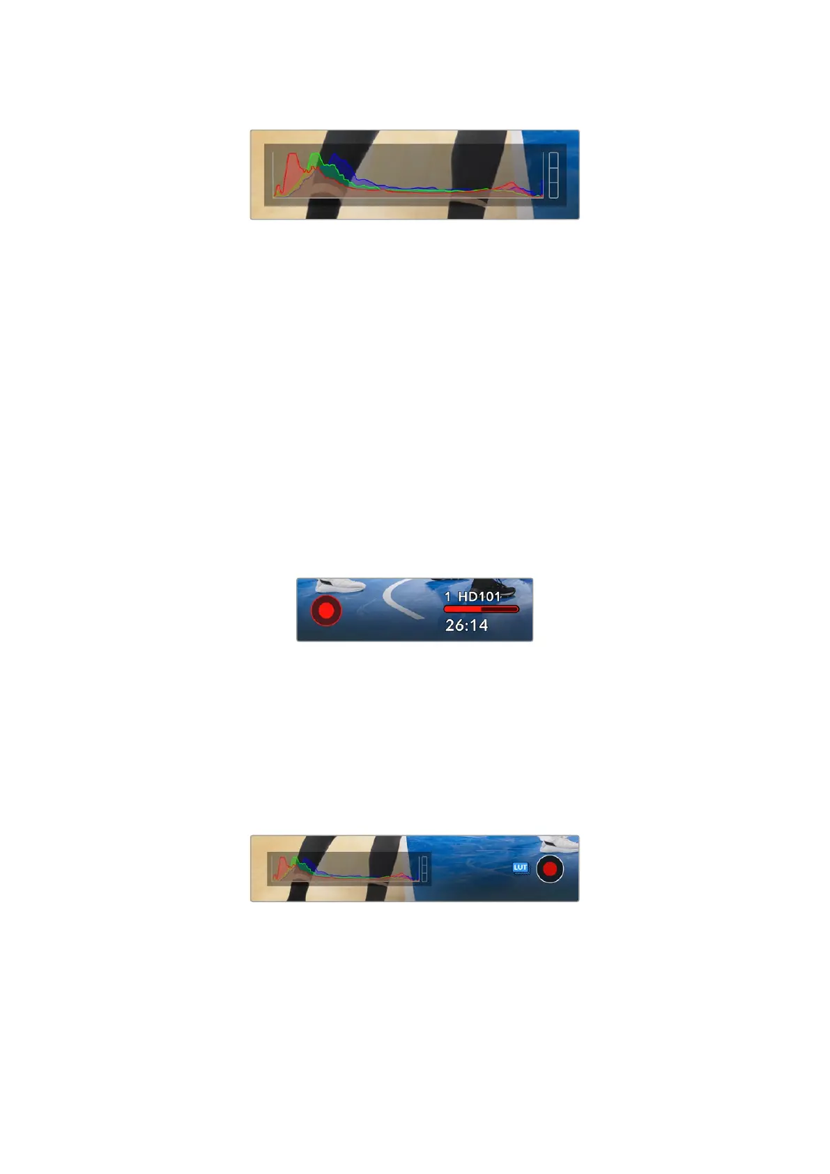 Ao lado do histograma, na parte inferior da saída HDMI da câmera, fica o indicador de gravação. Ao