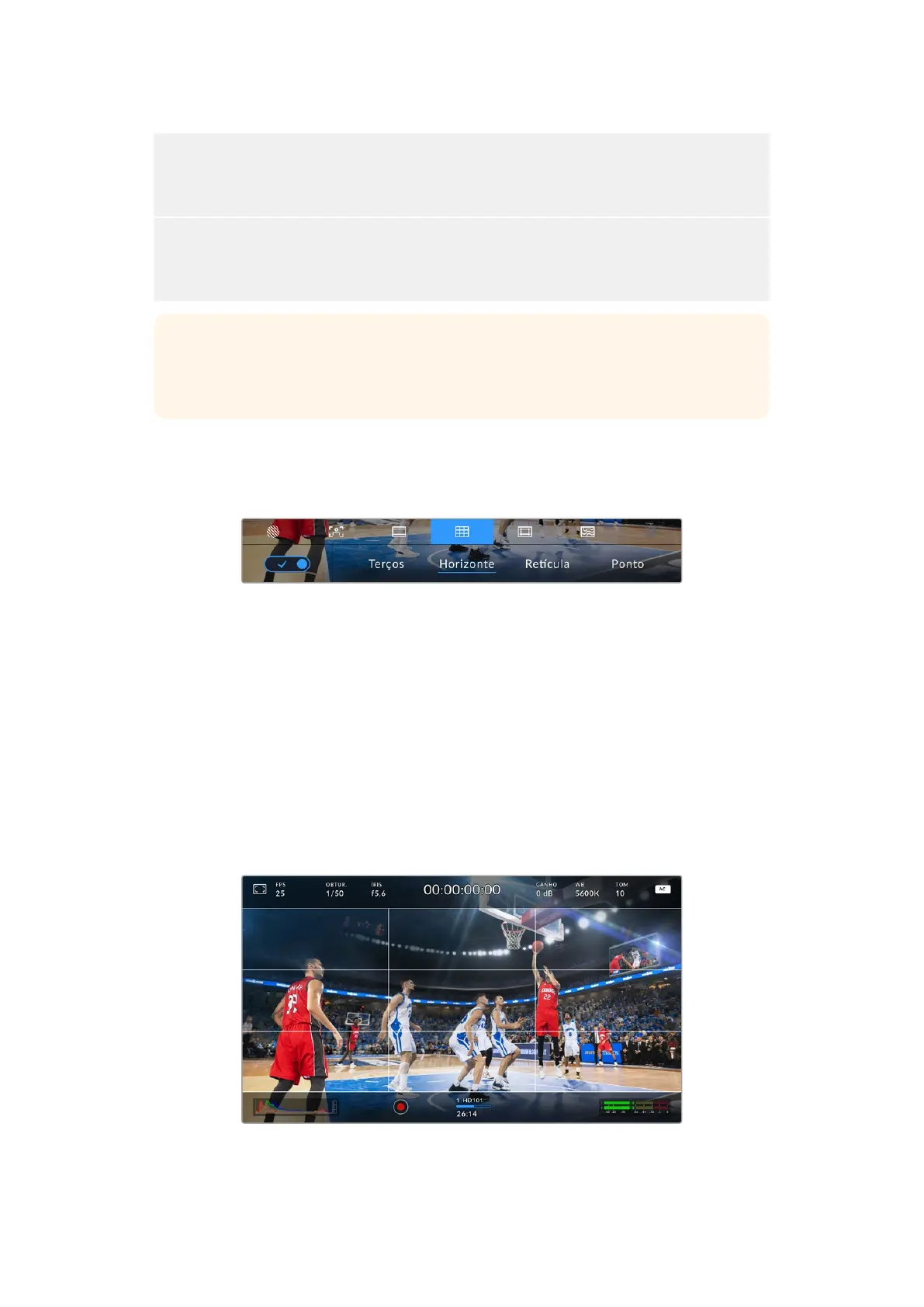 A configuração de grades alterna o modo de exibição para uma grade de regra dos terços,