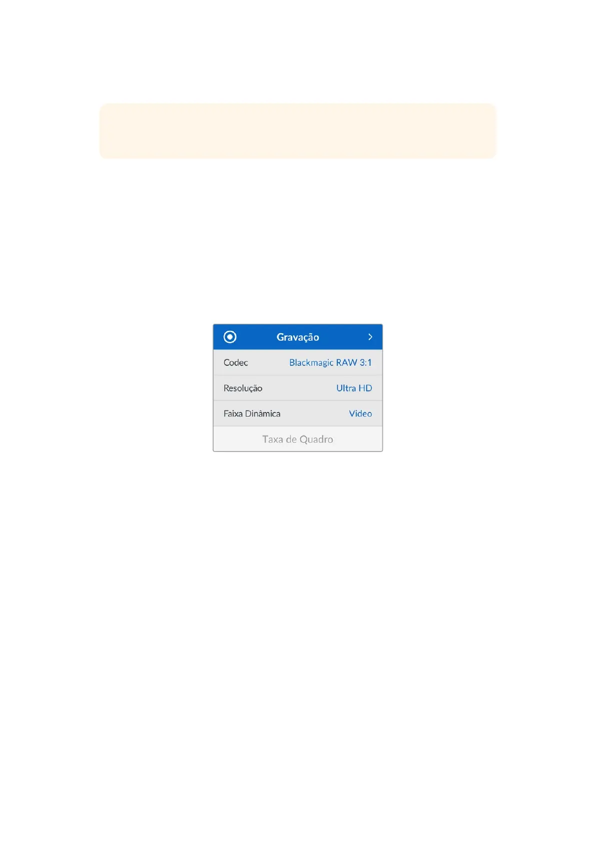 No menu “Codec” você pode definir a qualidade do Blackmagic RAW ao gravar em uma unidade