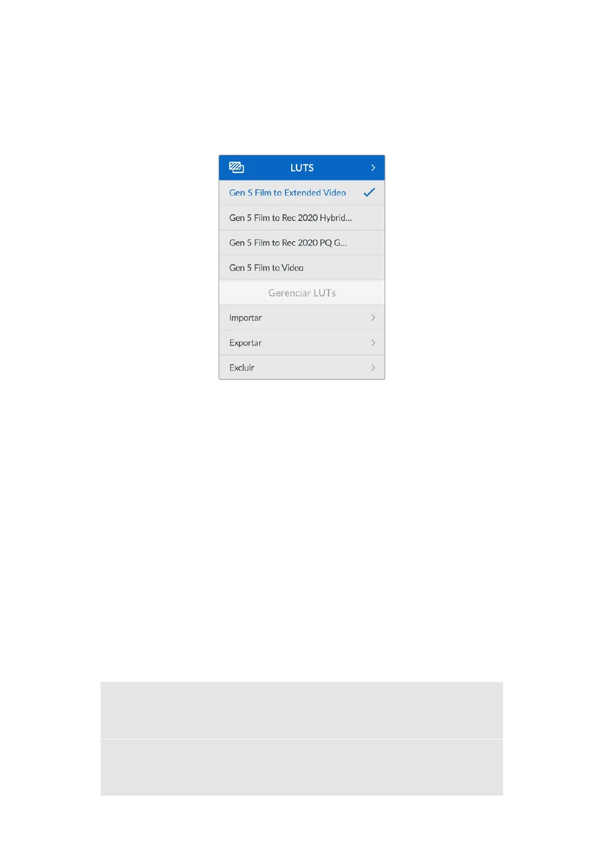 É possível aplicar LUTs 3D à saída HDMI da câmera e aos arquivos Blackmagic RAW. As LUTs