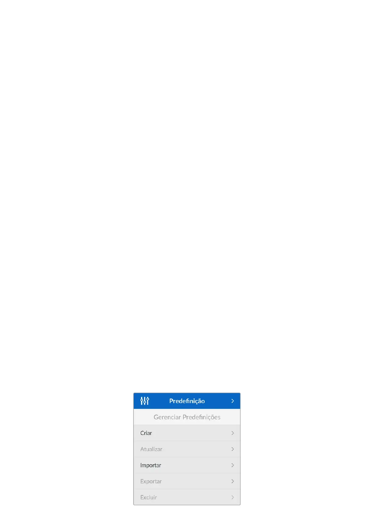 Neste menu você pode criar, importar, exportar e excluir predefinições na sua câmera.
