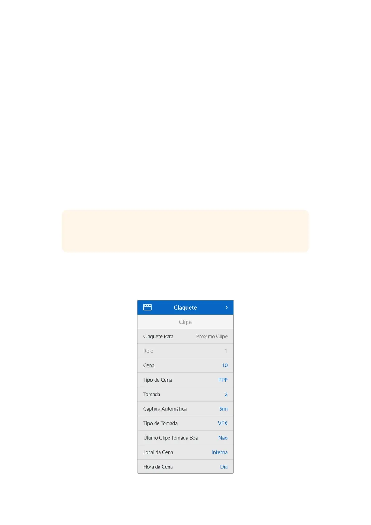 como as configurações de câmera, código de tempo, data e hora. É possível usar a claquete da