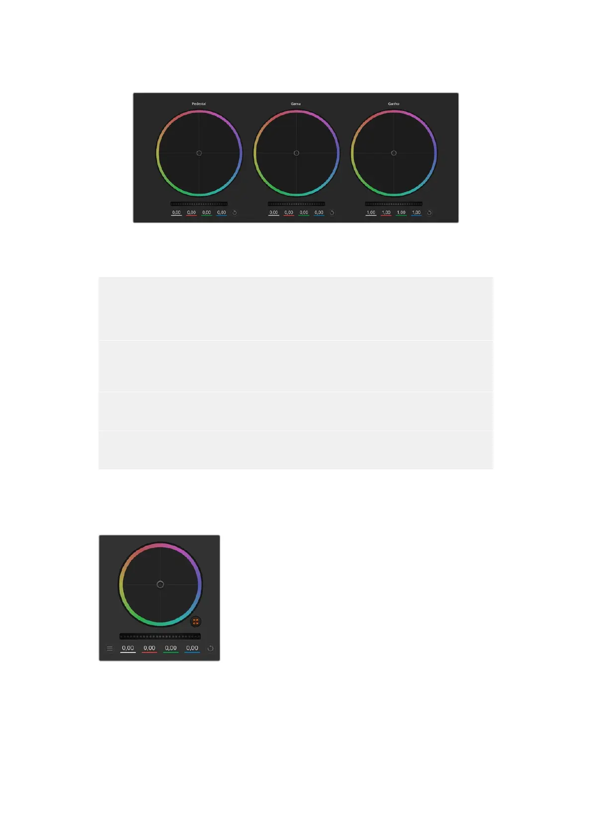 Os discos de cores Pedestal, Gama e Ganho no painel do corretor de cores.