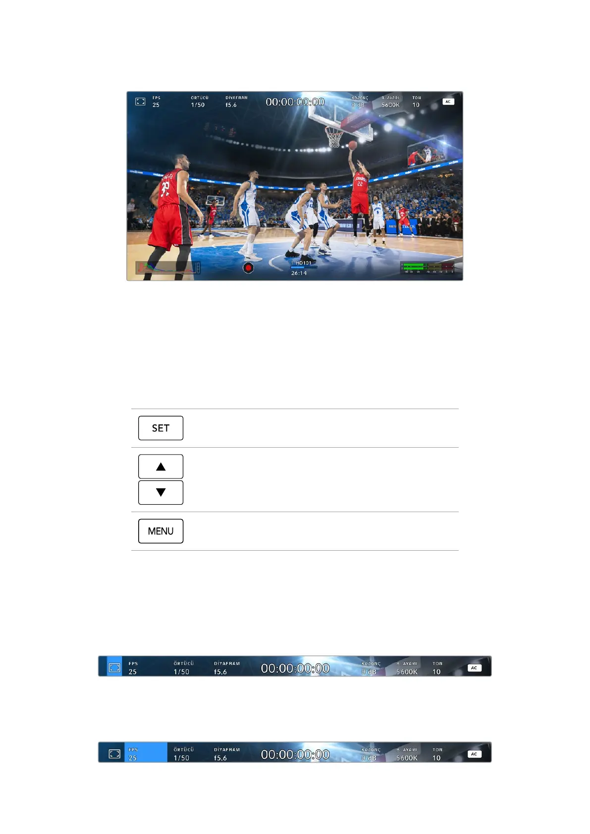 kısmındaki ayarlar çubuğunda gezinmek için kameranızın ok butonlarını kullanabilirsiniz ve bir