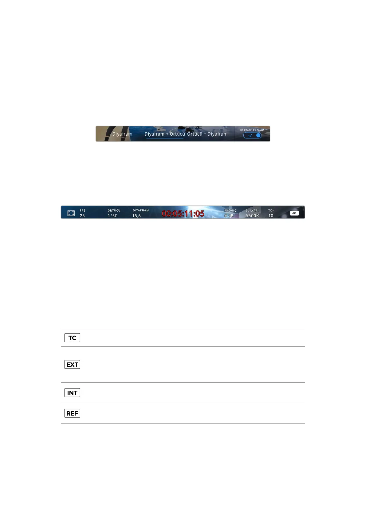 Geçerli bir harici zaman kodu sinyali bağlandığında, süre göstergesinin sağ tarafında bu