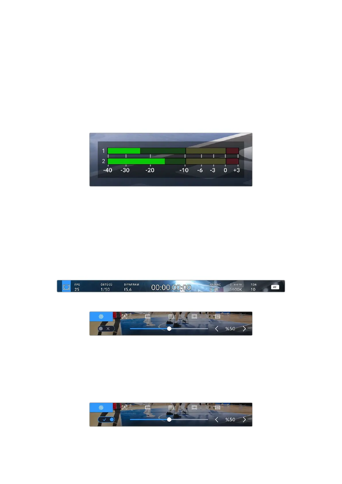Ses üst sınır göstergeleri, dahili mikrofon kullanıldığında veya harici ses bağlandığında, 1. ve 2.