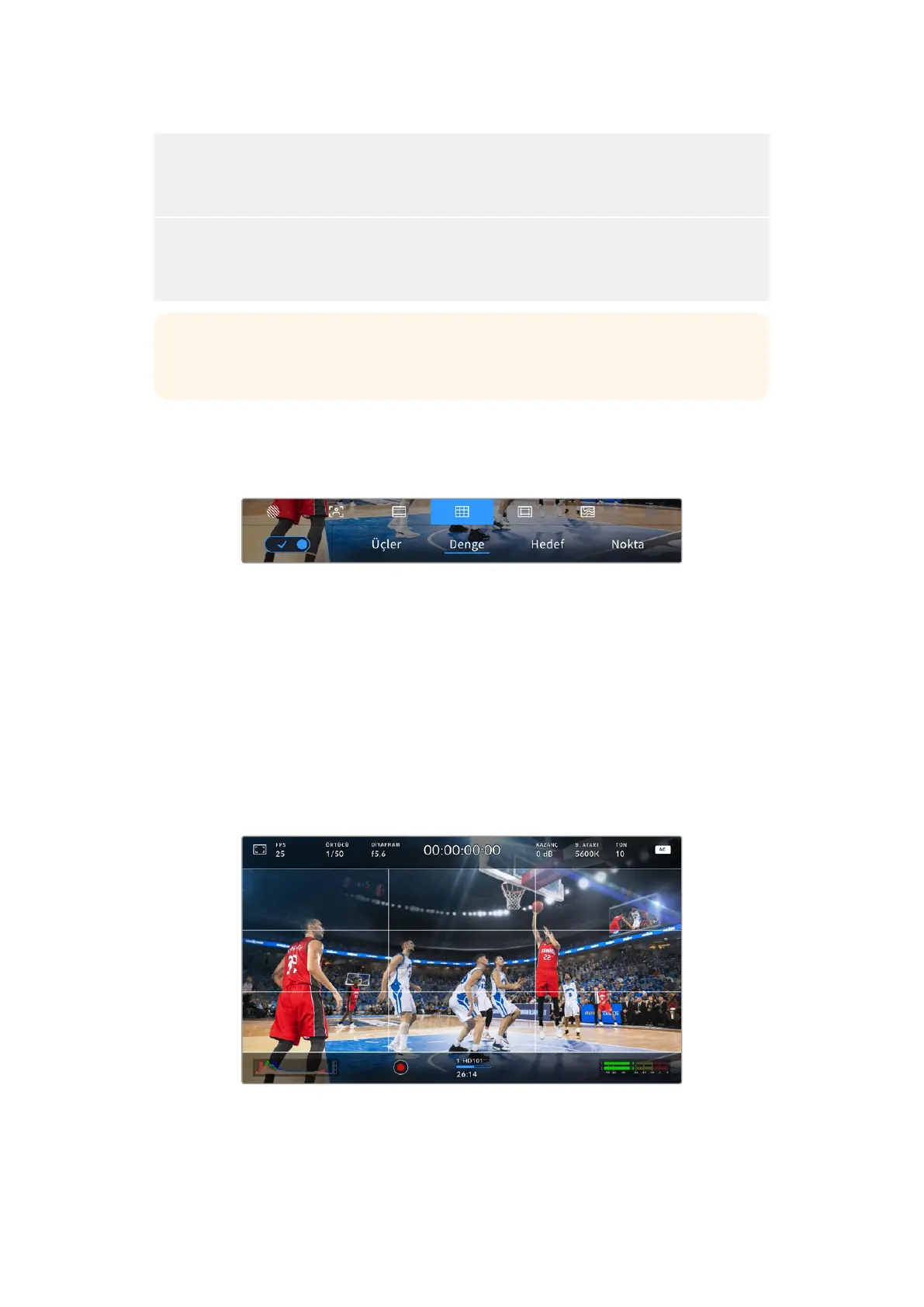 “Kılavuzlar” etkinleştirildiğinde, Micro Studio Camera 4K G2’niz; bir üçler kuralı ızgarası, denge,