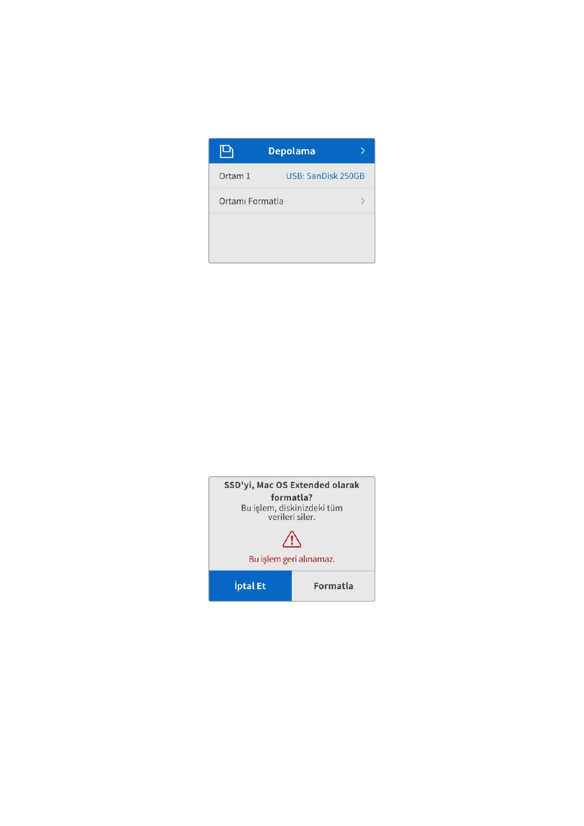 Ayrıca, bağlı olan bir USB-C flaş diski formatlamak için de bu menüyü kullanabilirsiniz.