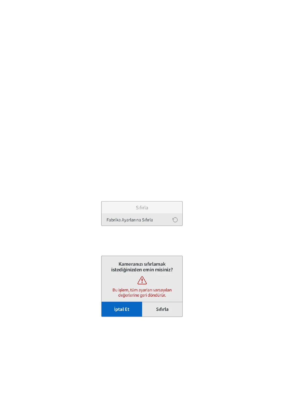Kameranız, kaydedilen tüm LUT ve önayarları siler ve tüm ayarları fabrika ayarlarına geri