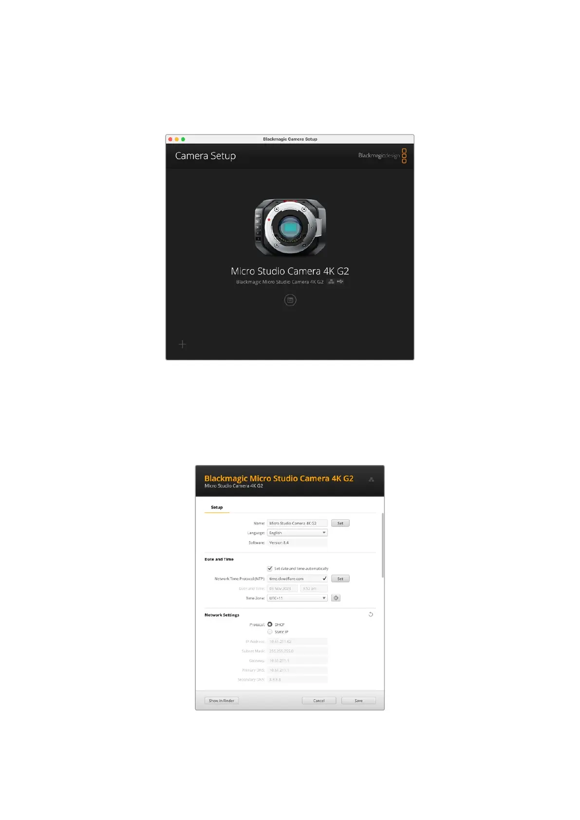 2 Blackmagic Camera Setup yazılımını açın. Micro Studio Camera 4K G2’nizin ismi, kurulum