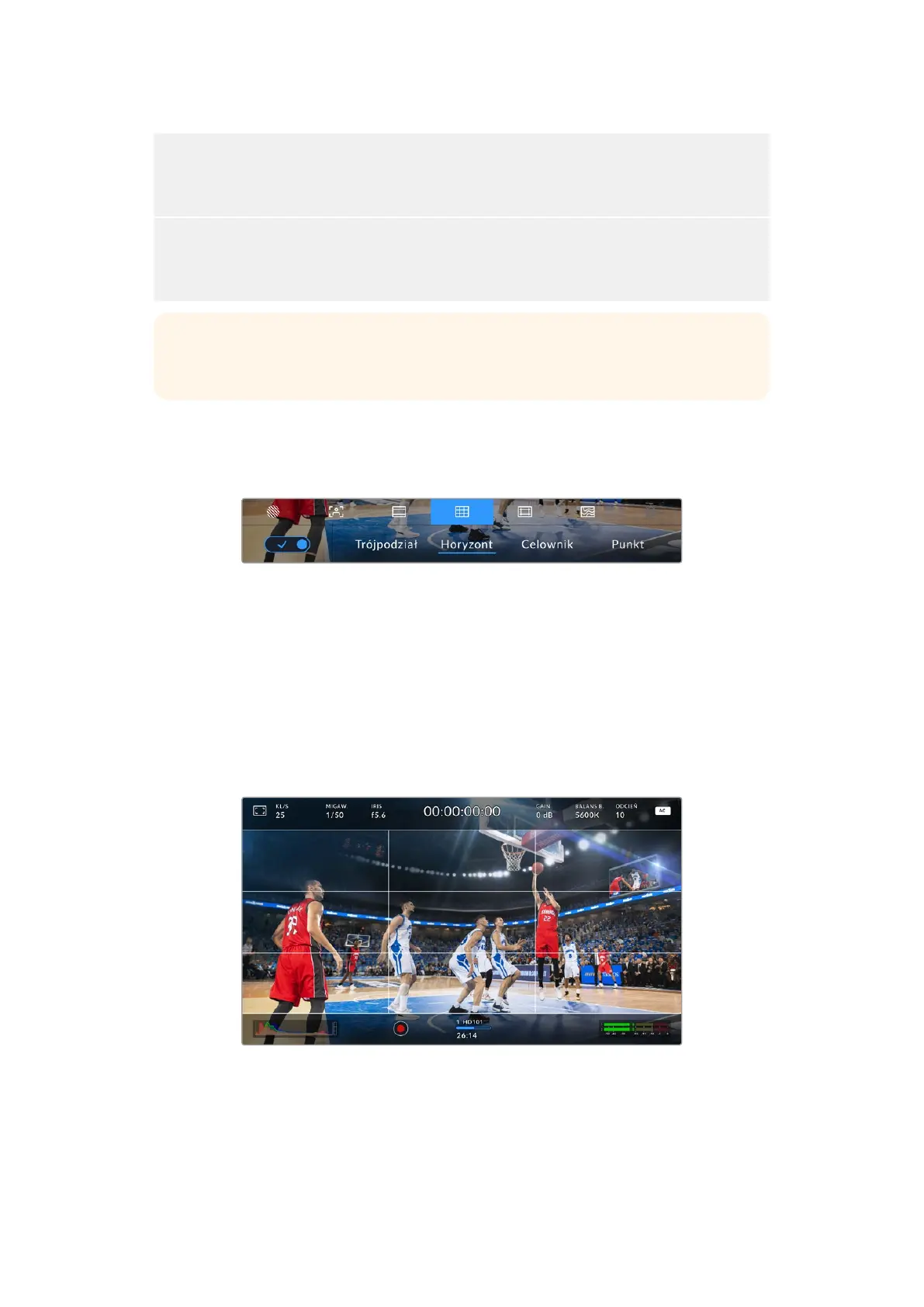 kamera Micro Studio 4K G2 wyświetla siatkę trójpodziału, horyzont, celownik lub punkt.