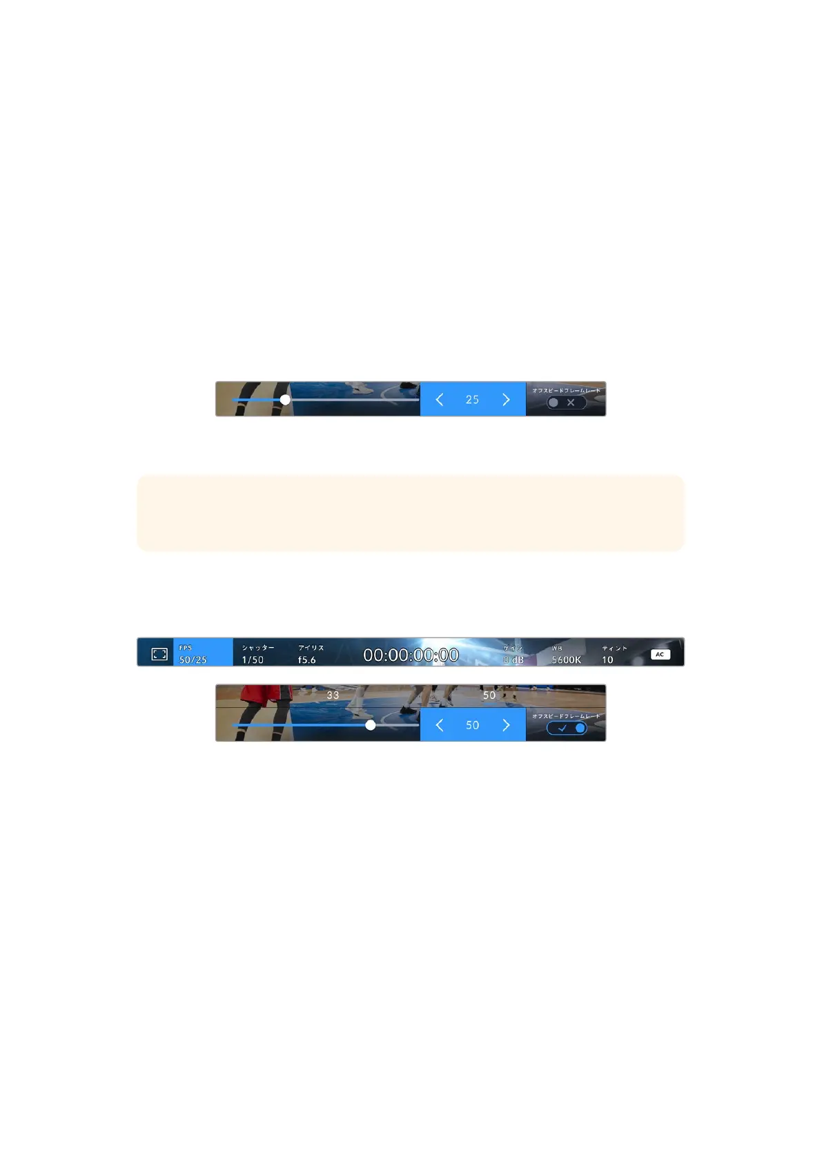 オフスピードフレームレートを変更するには、画面底部に表示されているフレームレートのインジケー