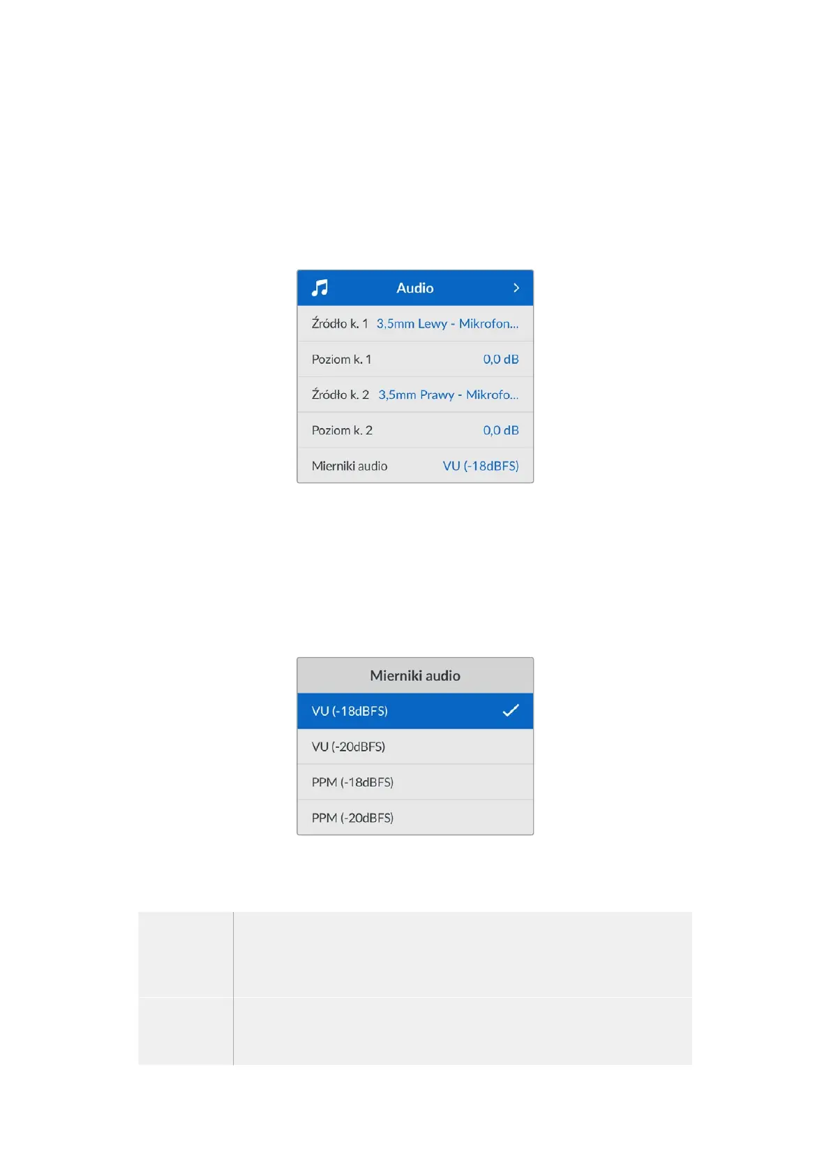 Zakładka Audio umożliwia dostosowanie ustawień wejścia audio i monitorowania w kamerze