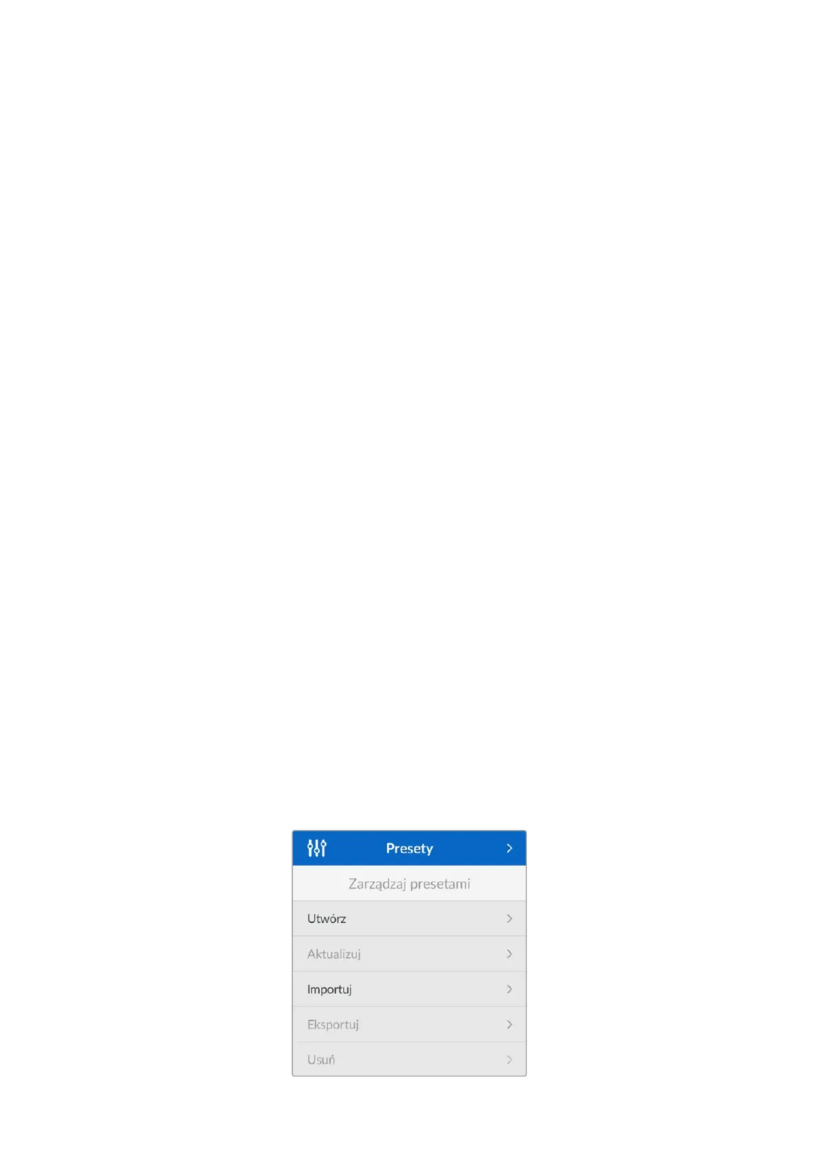 Menu Zarządzaj presetami umożliwia tworzenie, importowanie, eksportowanie i usuwanie