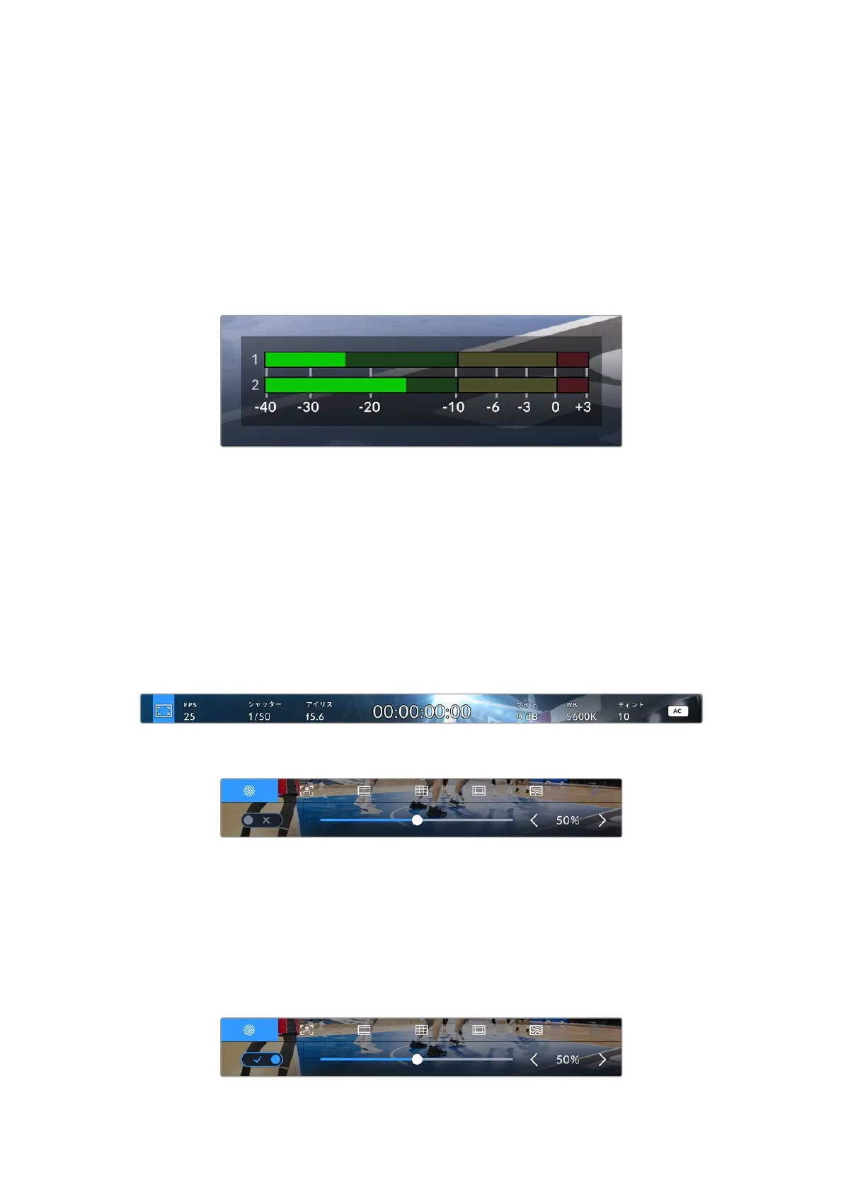 している場 合は外 部 オーディオのオーディオレベルを表示します。PPMまたはVUメーターを表示できま