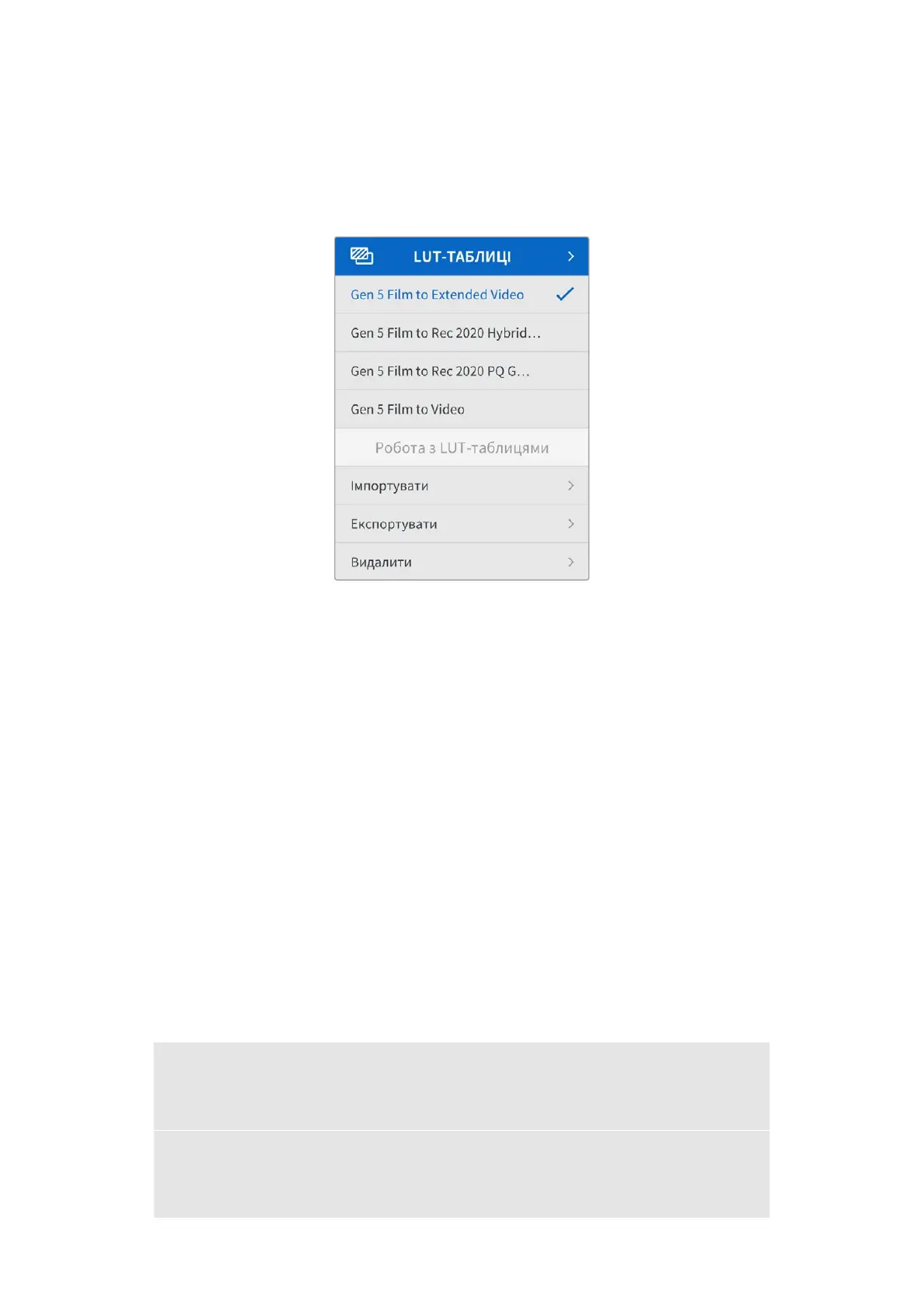 Меню «LUT-ТАБЛИЦІ» дозволяє вибирати вбудовані 3DLUT-таблиці, а також експортувати та