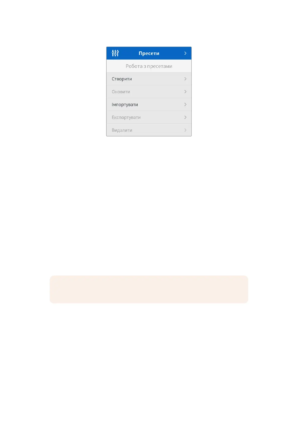 ПРИМІТКА. Якщо не залишилося вільних слотів для пресетів, меню імпорту буде