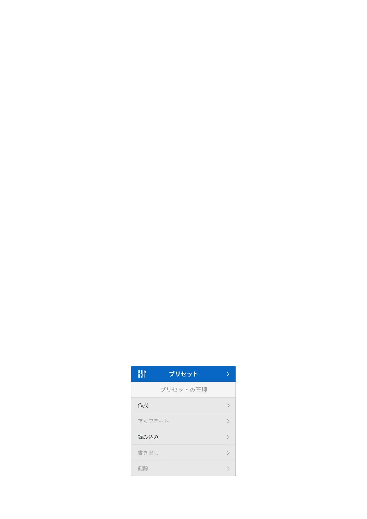 このメニューでは、カメラでプリセットの作成、読み込み、書き出し、削除を実行できます。