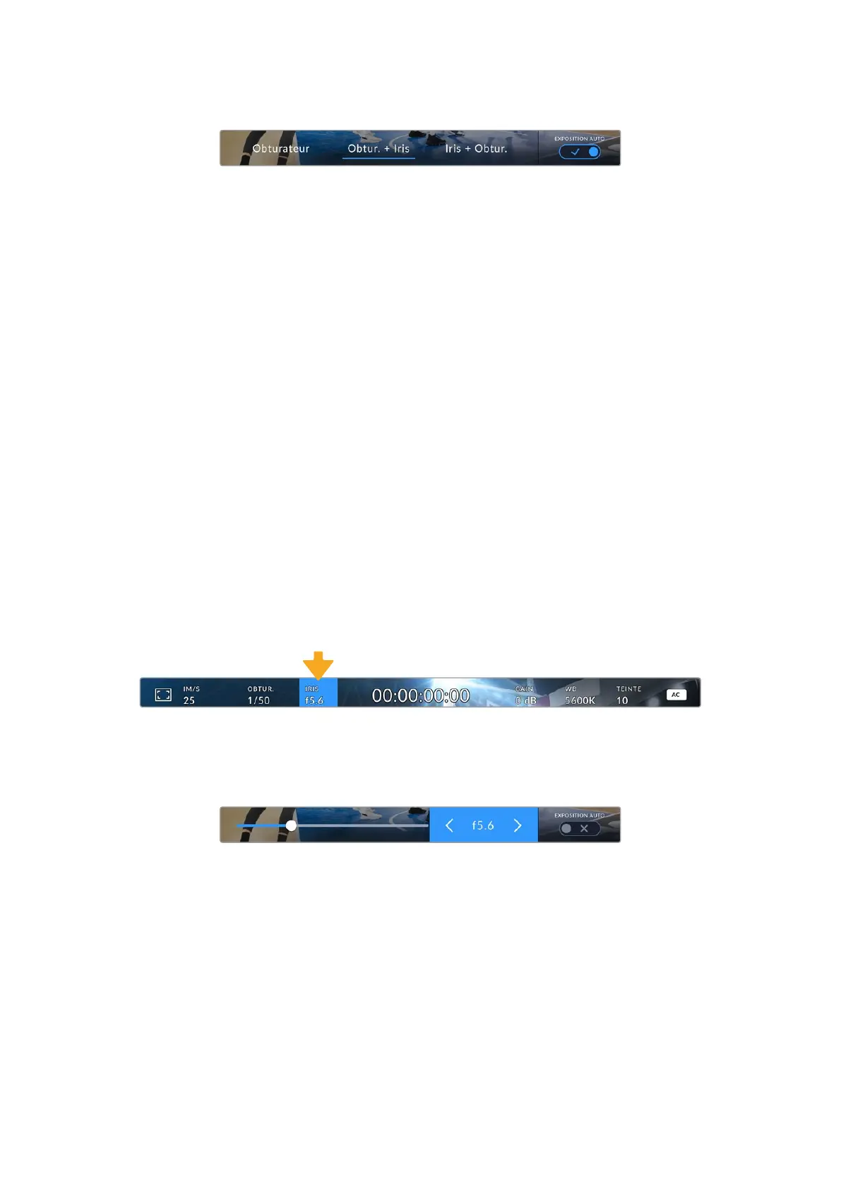 Le menu de l’iris s’affiche en bas de l’écran HDMI. Pour modifier l’ouverture, utilisez les boutons pour