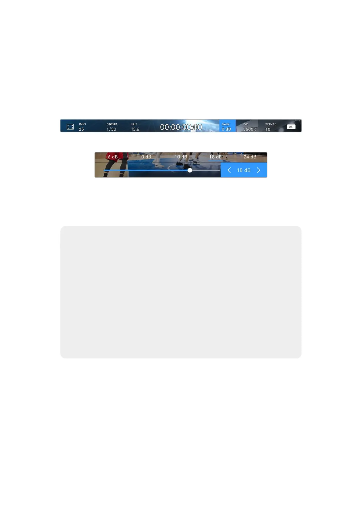 L’indicateur Gain affiche le gain (sensibilité de la lumière) actuellement réglé sur votre caméra. Le