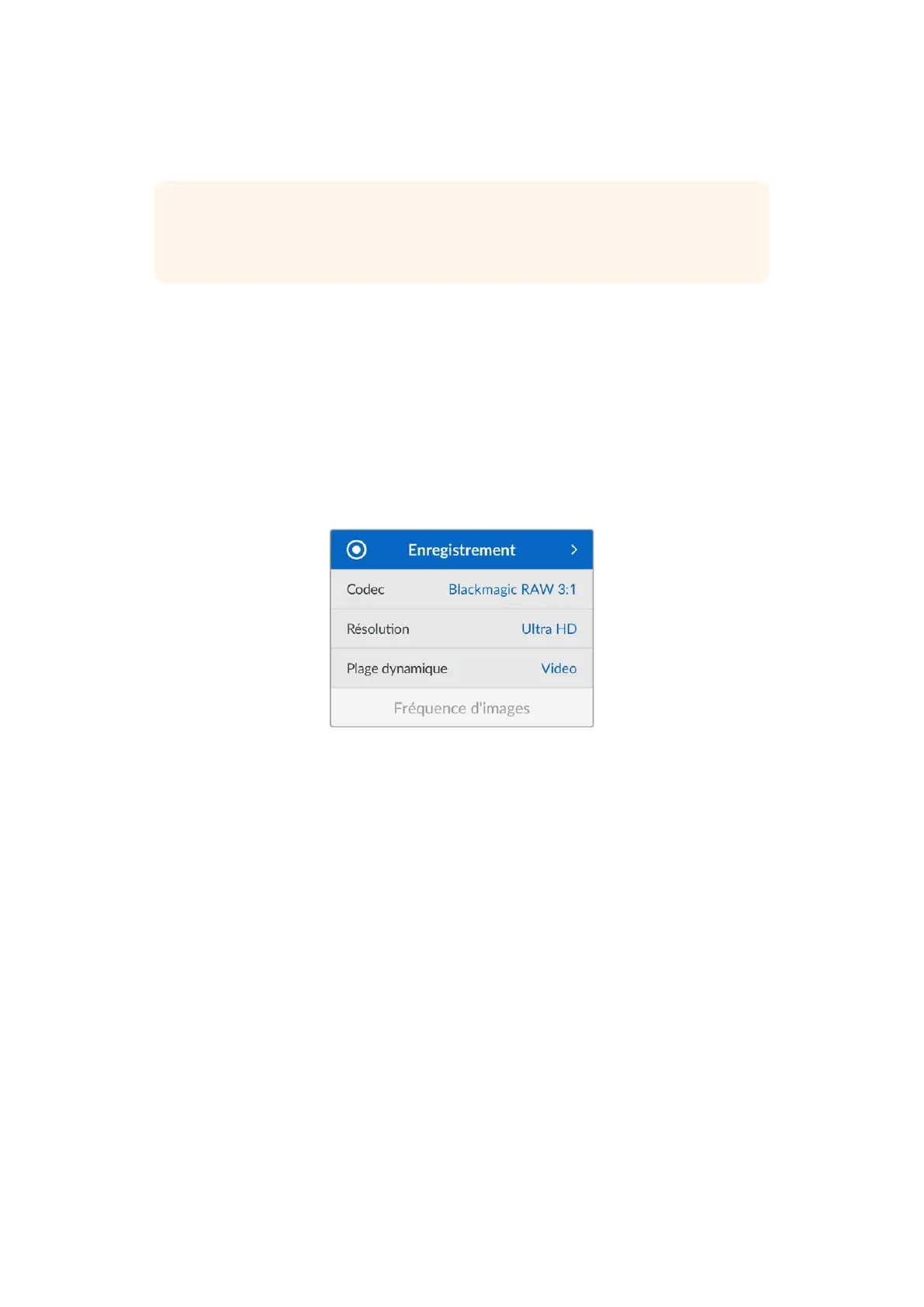 Le menu Codec vous permet de régler la qualité du Blackmagic RAW lorsque vous enregistrez sur