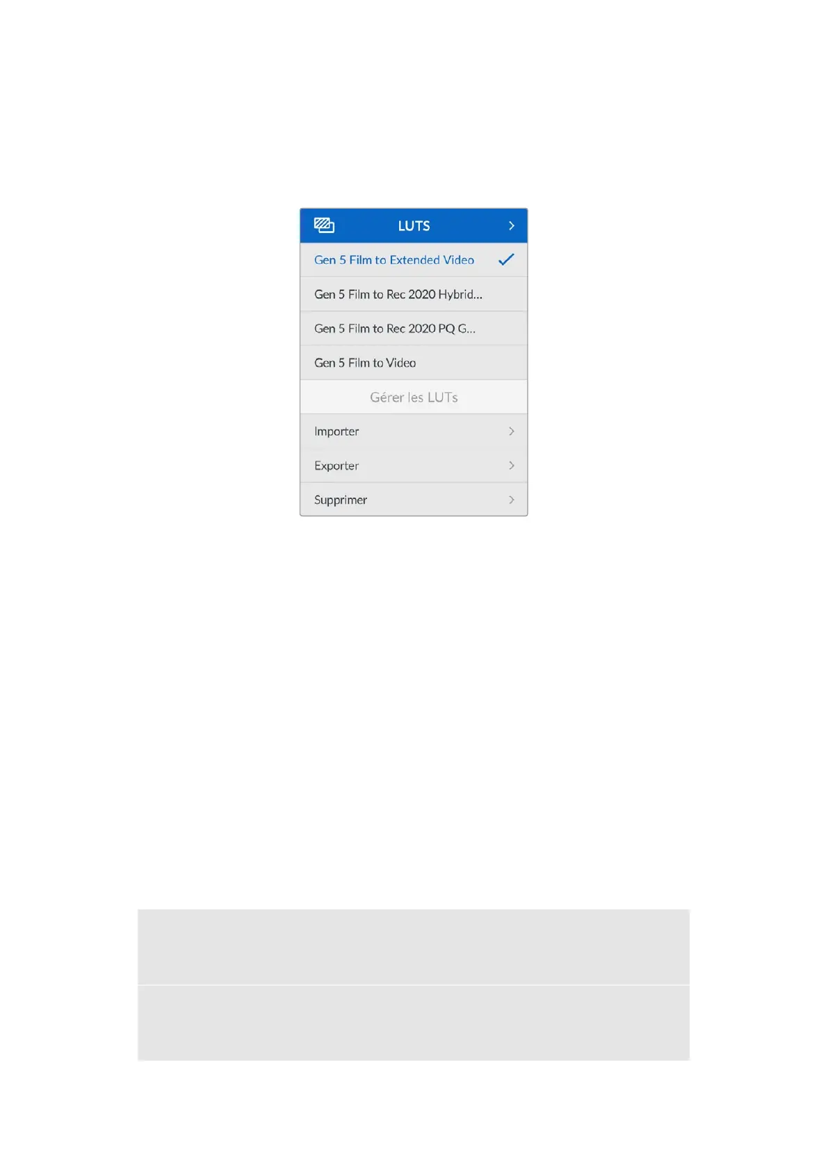 Le menu LUTS vous permet de choisir une LUT intégrée, ainsi que d'importer et d'exporter des LUTs
