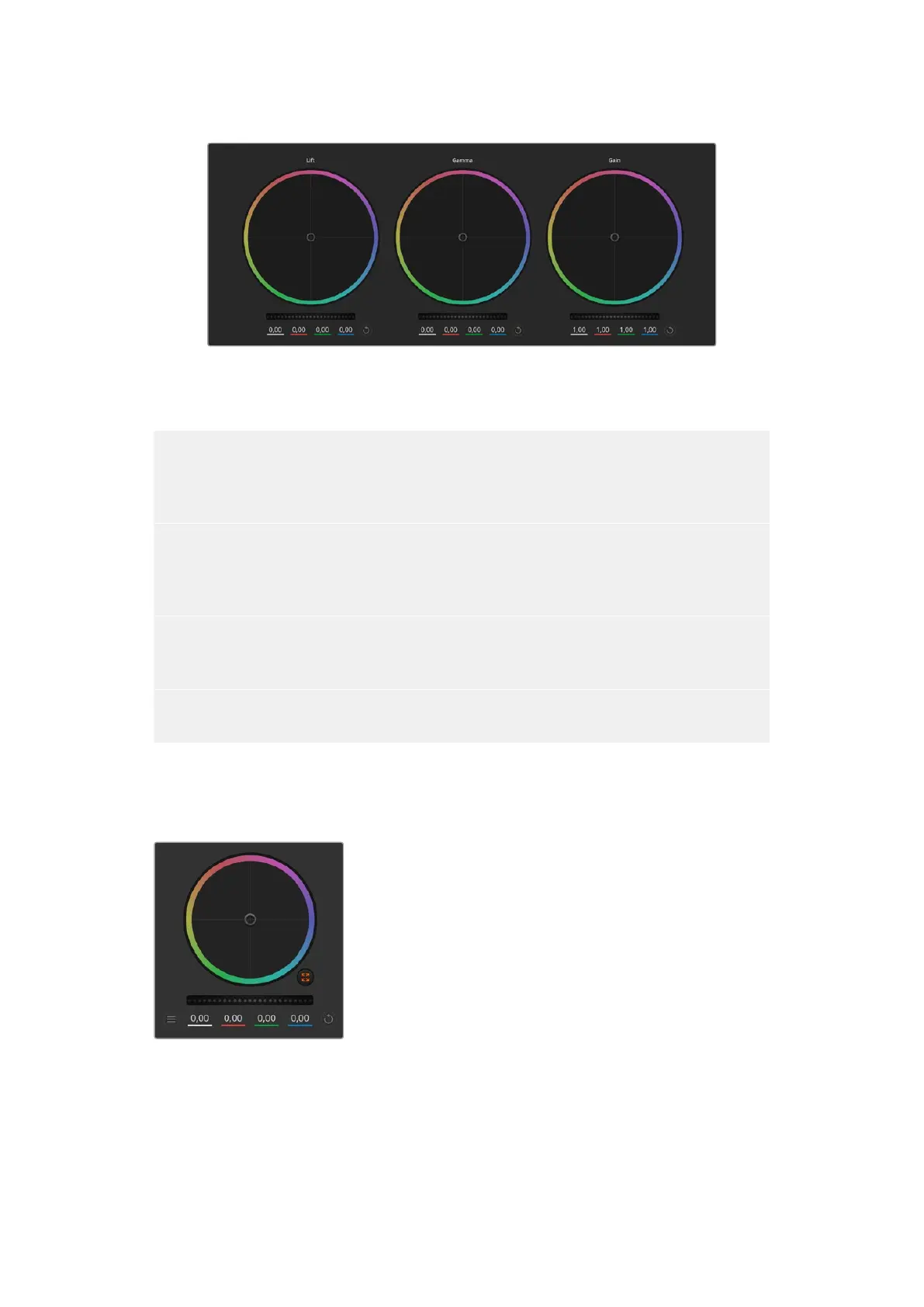 Roues chromatiques Lift, Gamma et Gain dans la fenêtre de correction colorimétrique