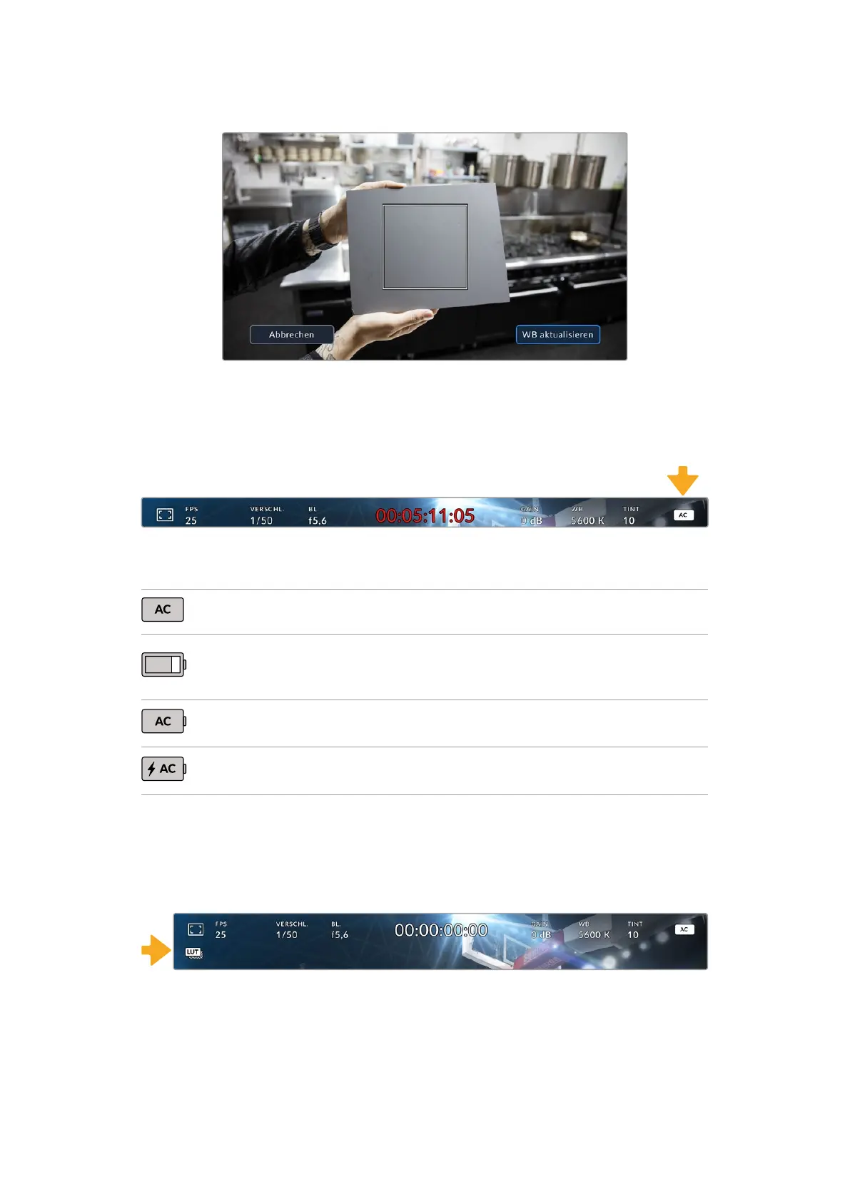 oben links auf dem Display ein weißer LUT-Indikator. Ist in den „Aufzeichnung“-Einstellungen die