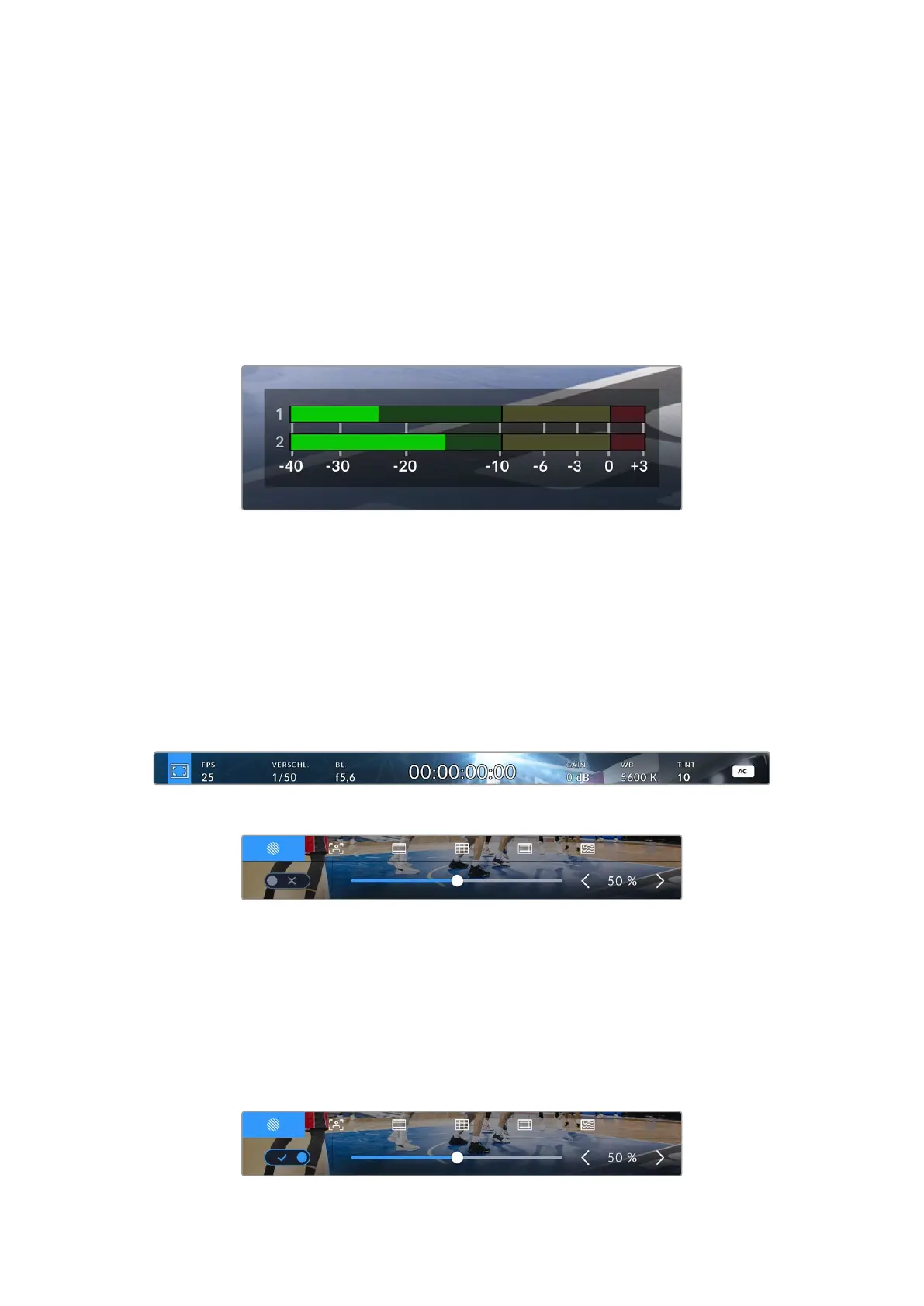 Audiopegelmeter die Tonpegel für Kanäle1 und 2 an. Zur Wahl steht die Anzeige als PPM- oder