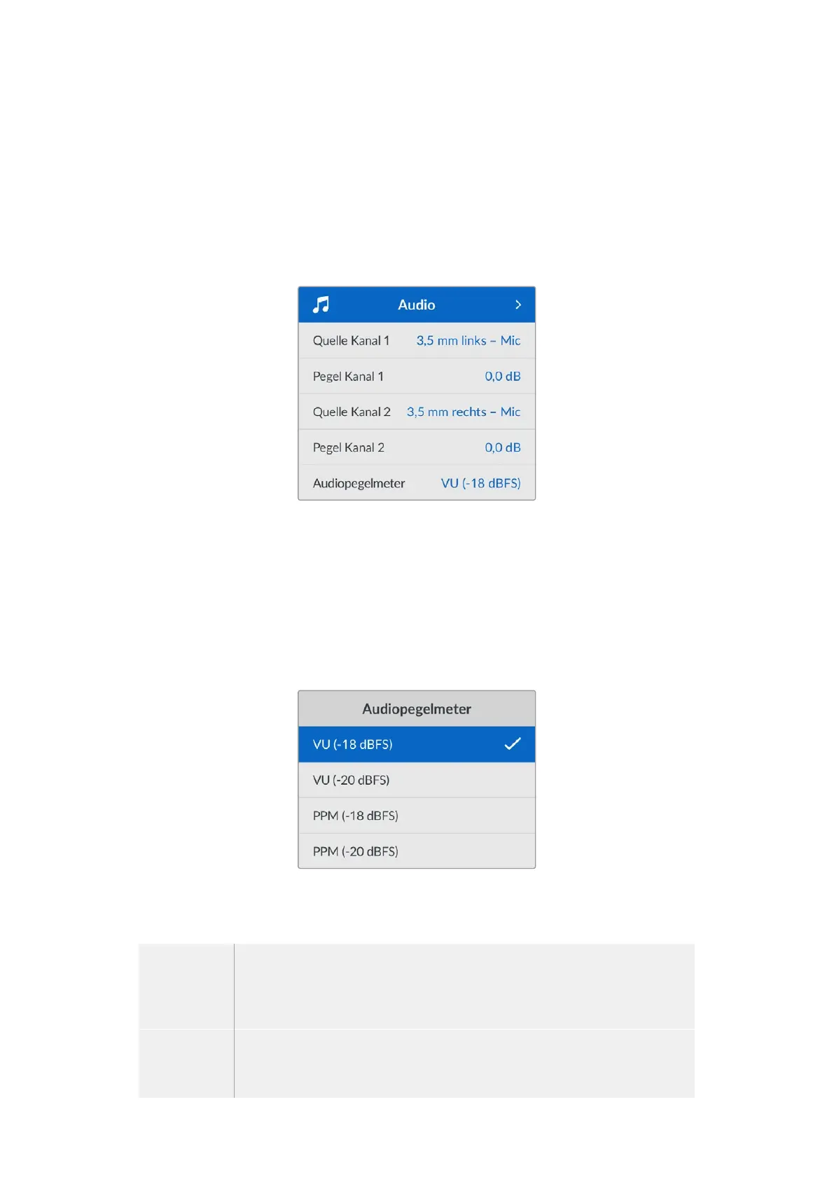 Sie können sich die Audiopegelmeter wahlweise als VU- oder PPM-Meter anzeigen lassen. VU-