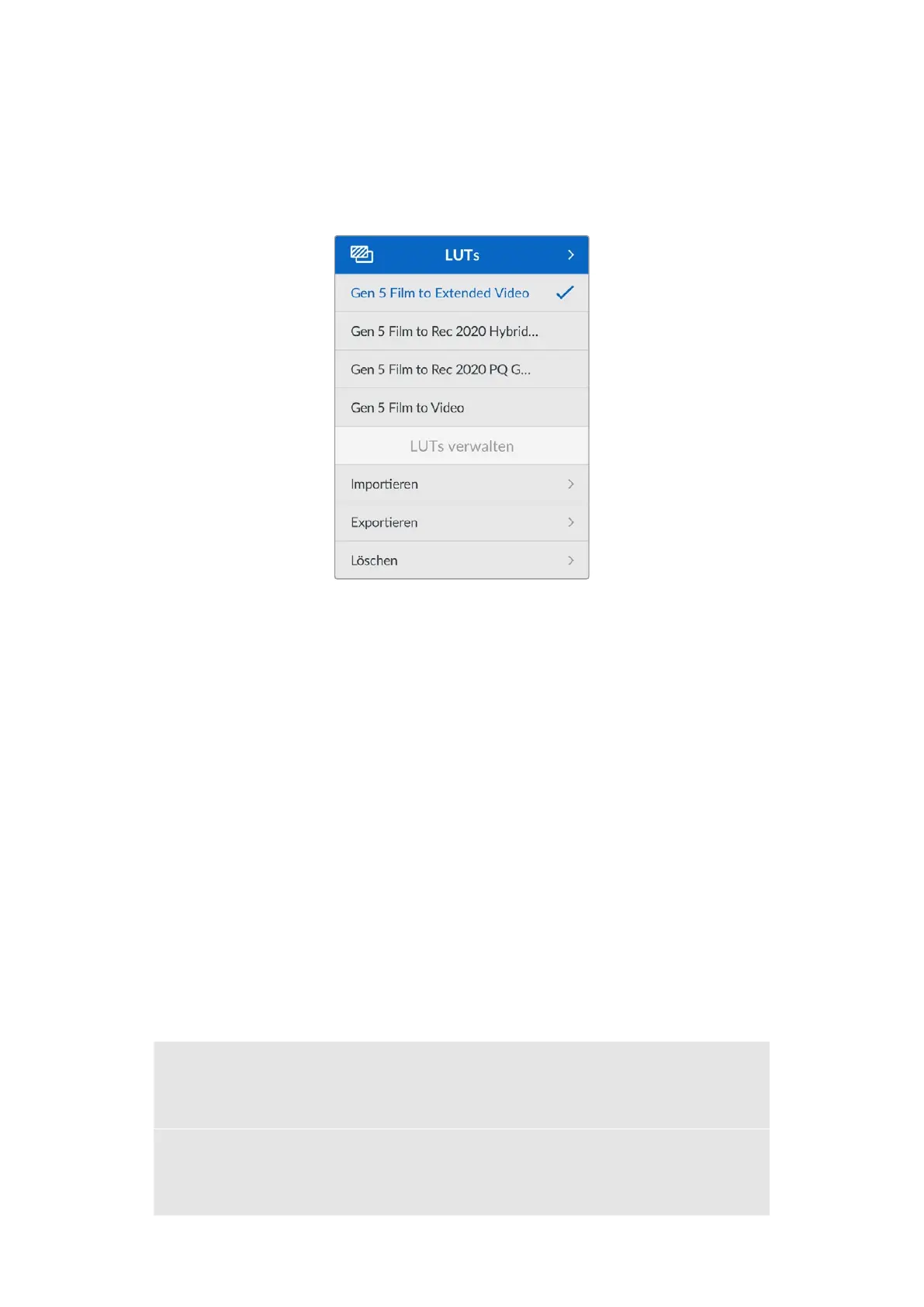 3D-LUTs lassen sich auf die HDMI-Ausgabe und auf Blackmagic-RAW-Dateien anwenden. LUTs