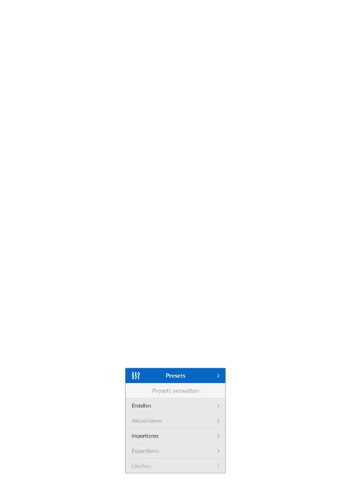 In diesem Menü können Sie auf Ihrer Kamera Presets erstellen, importieren, exportieren und löschen.