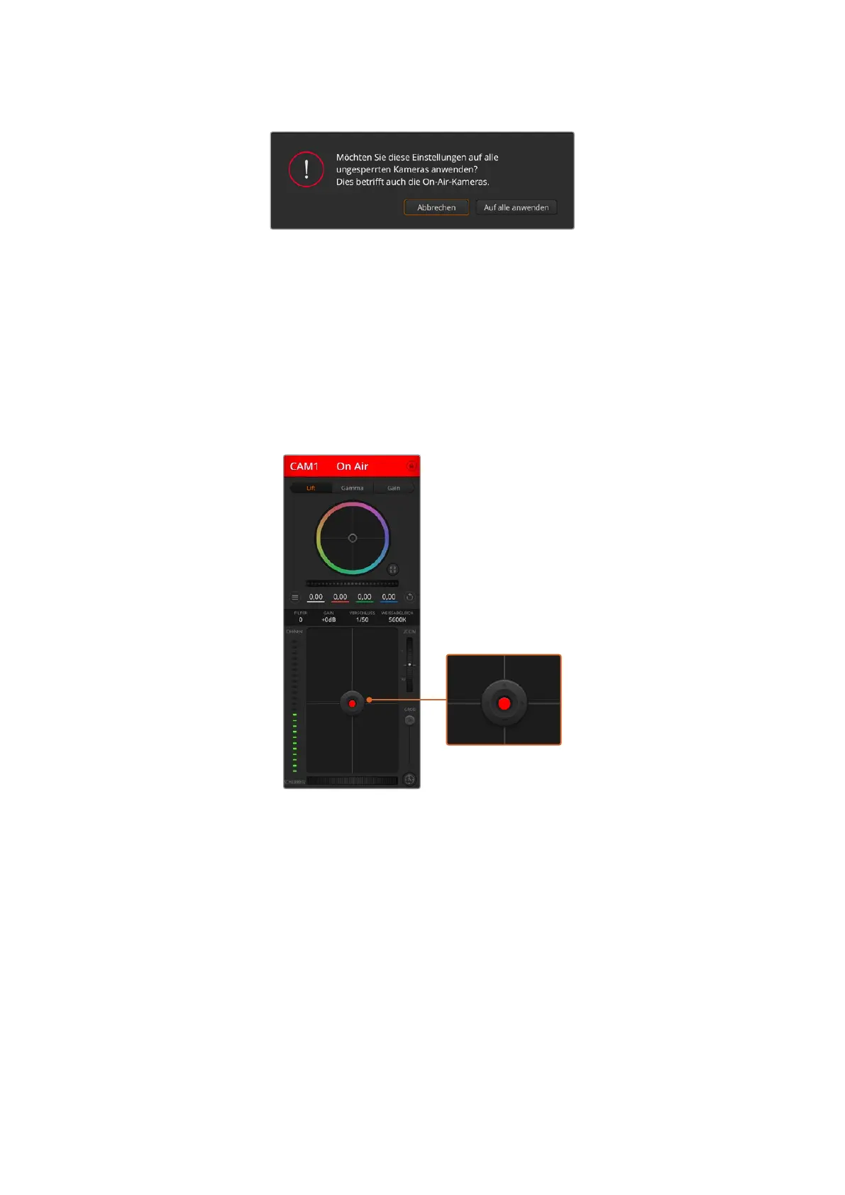 Blende und Schwarzabhebung werden über den kreisförmigen Button im Fadenkreuz der einzelnen