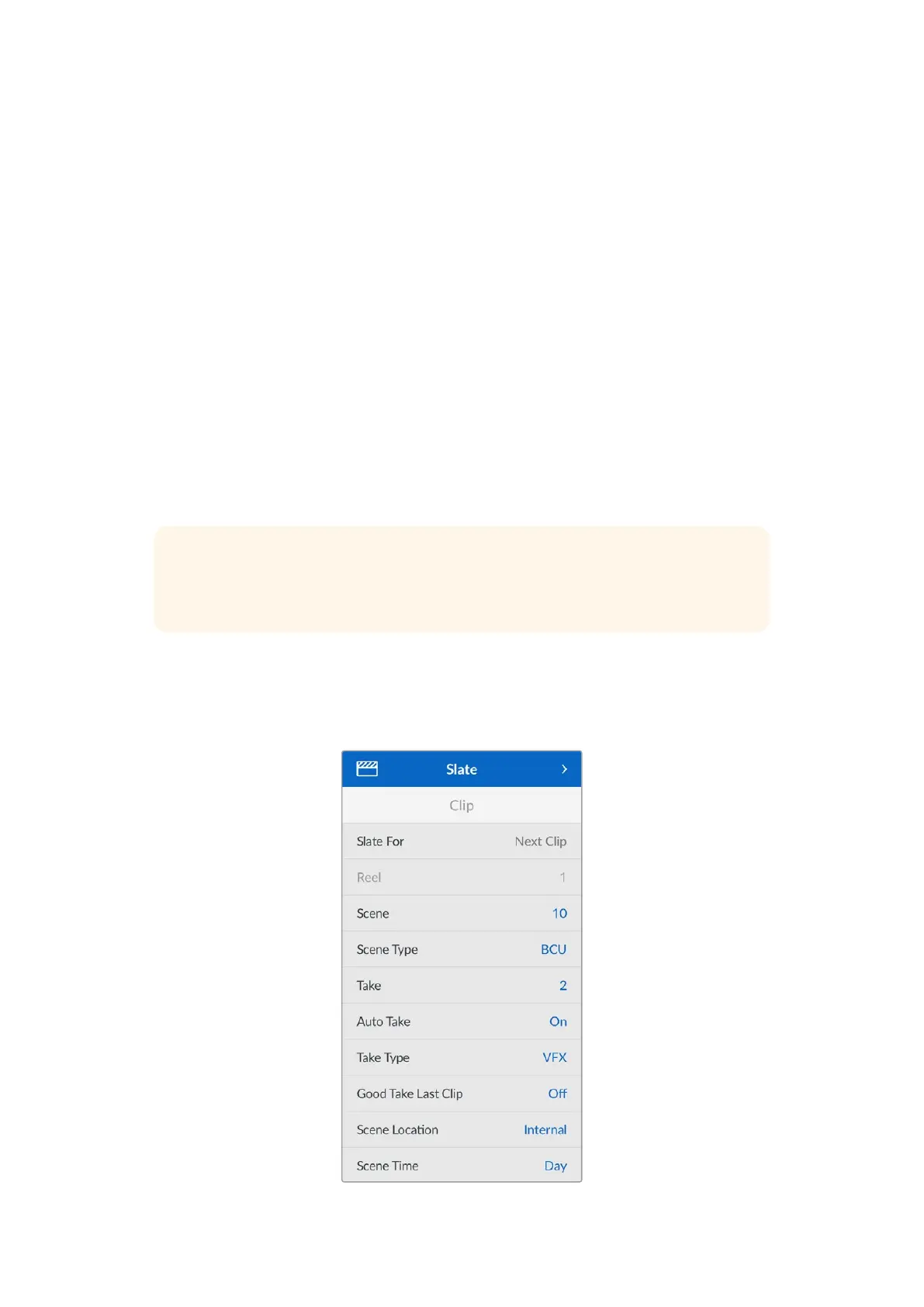 such as camera settings, timecode, date and time. You can use your camera’s slate to add many
