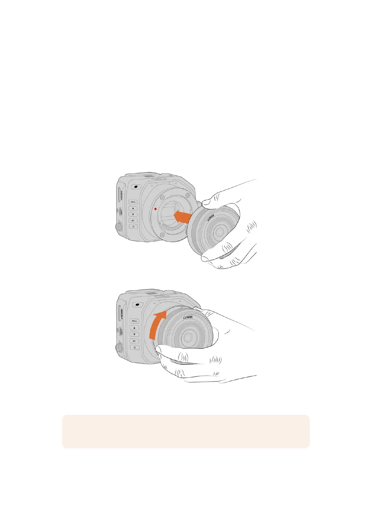 Blackmagic Micro Studio Camera 4K G2使用MFT镜头。安装镜头前,请先取下镜头防尘盖。操作