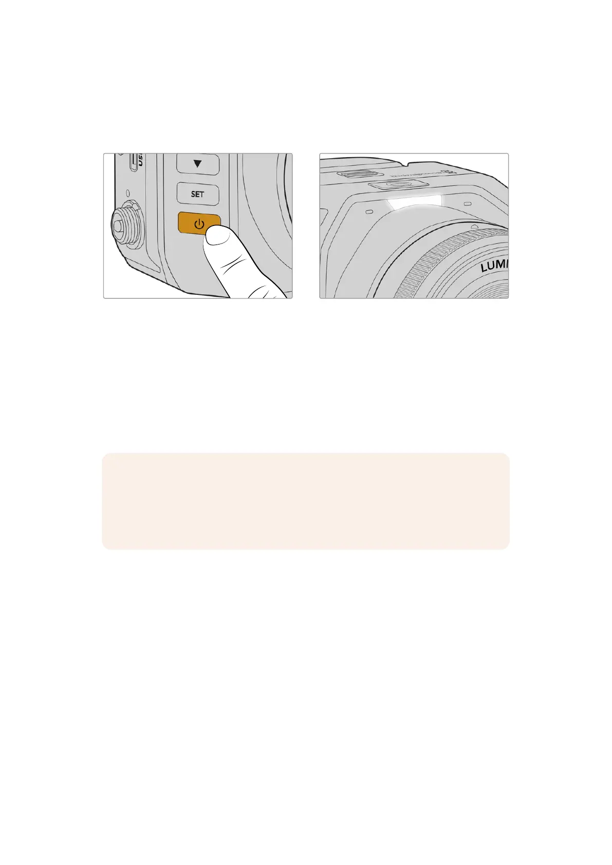 按下左侧面板的电源按钮可开启摄影机。开机时,摄影机的Tally灯将会亮起白色。