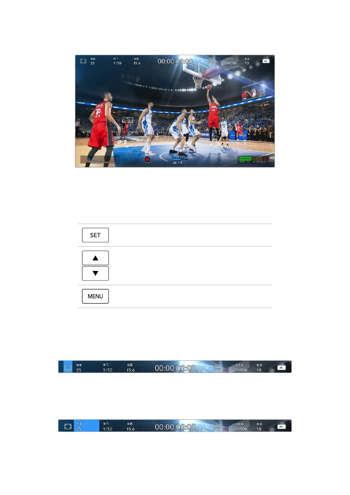 HUD可以快速调整各类摄影机设置,包括帧率、快门、增益以及白平衡。要进入这些设置,可按“SET”按钮
