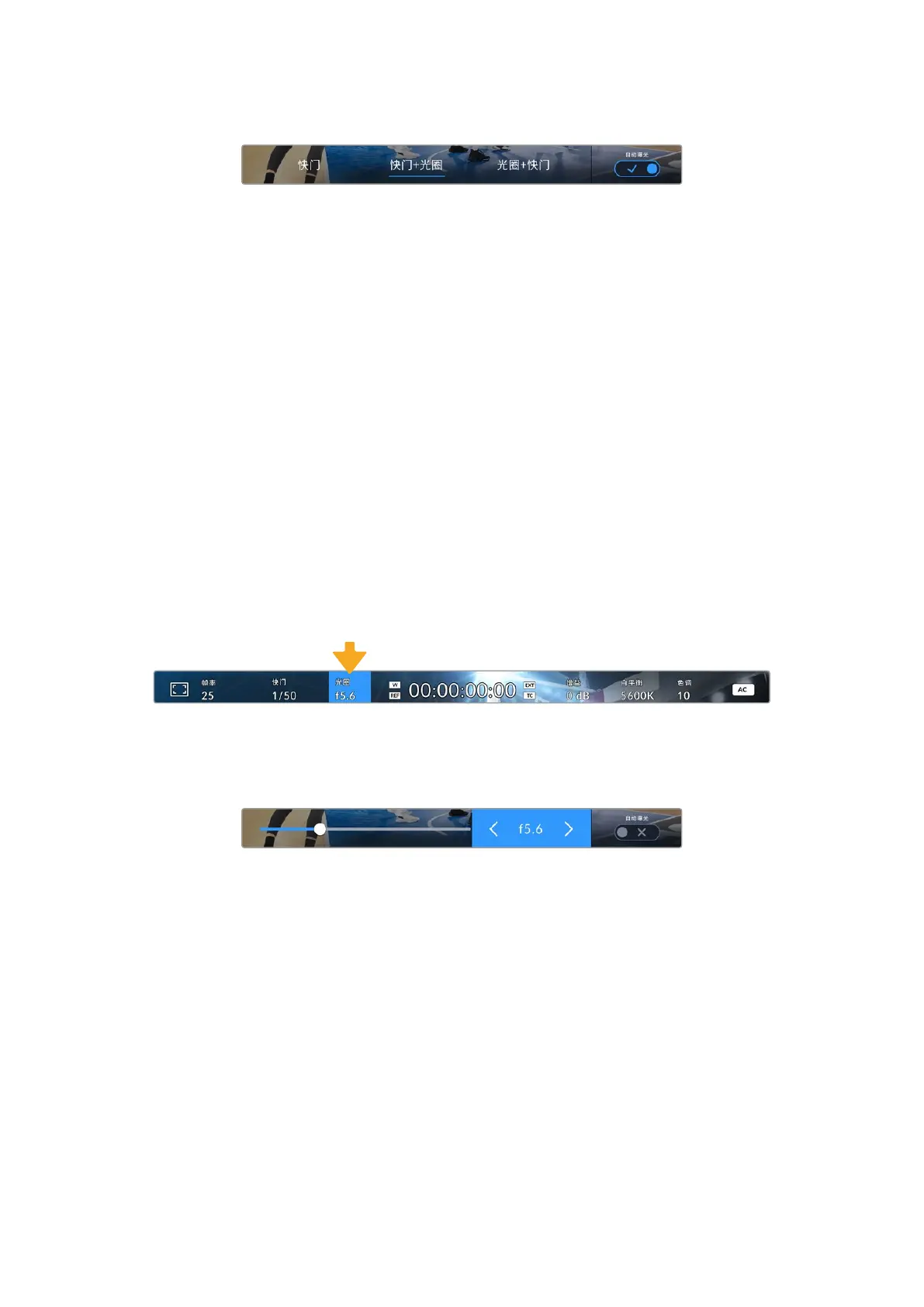 启用光圈菜单最右侧的“自动曝光”开关图标可打开光圈自动曝光菜单。