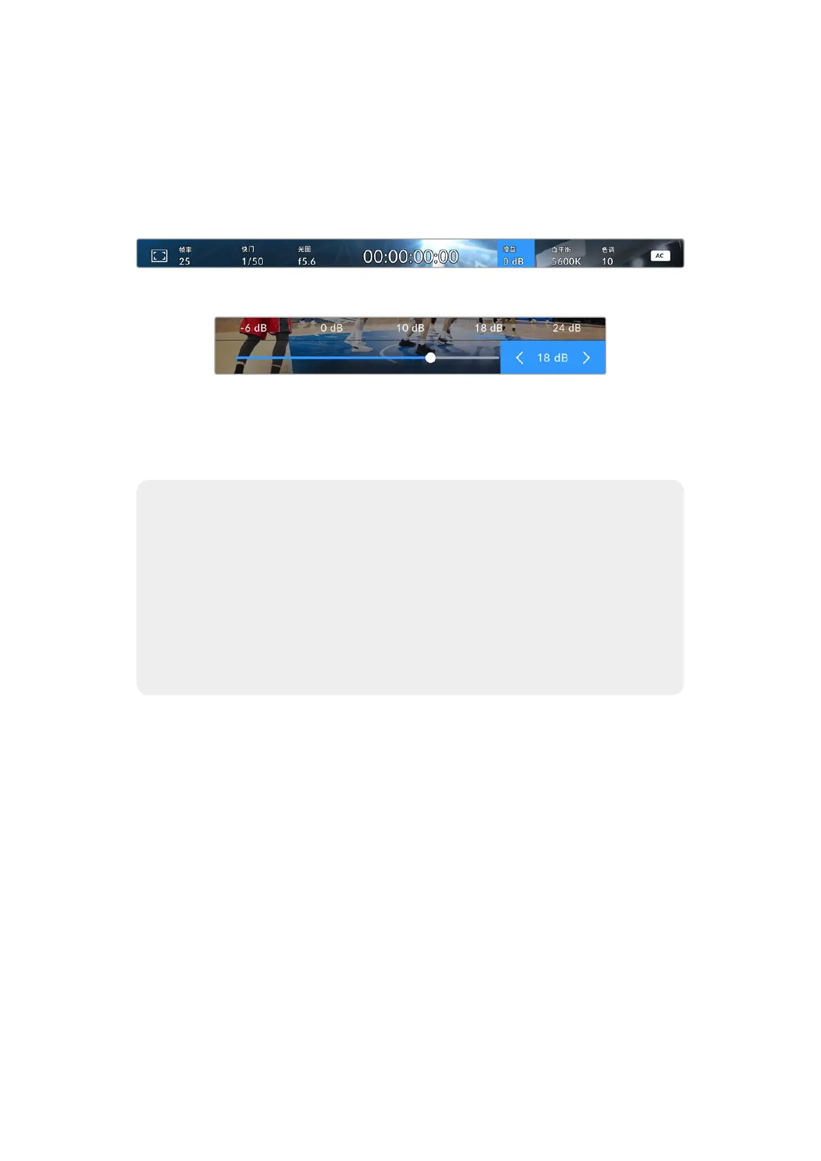 “增益”提示可显示摄影机当前的增益设置,也就是摄影机对光线的敏感度。摄影机的理想设置是