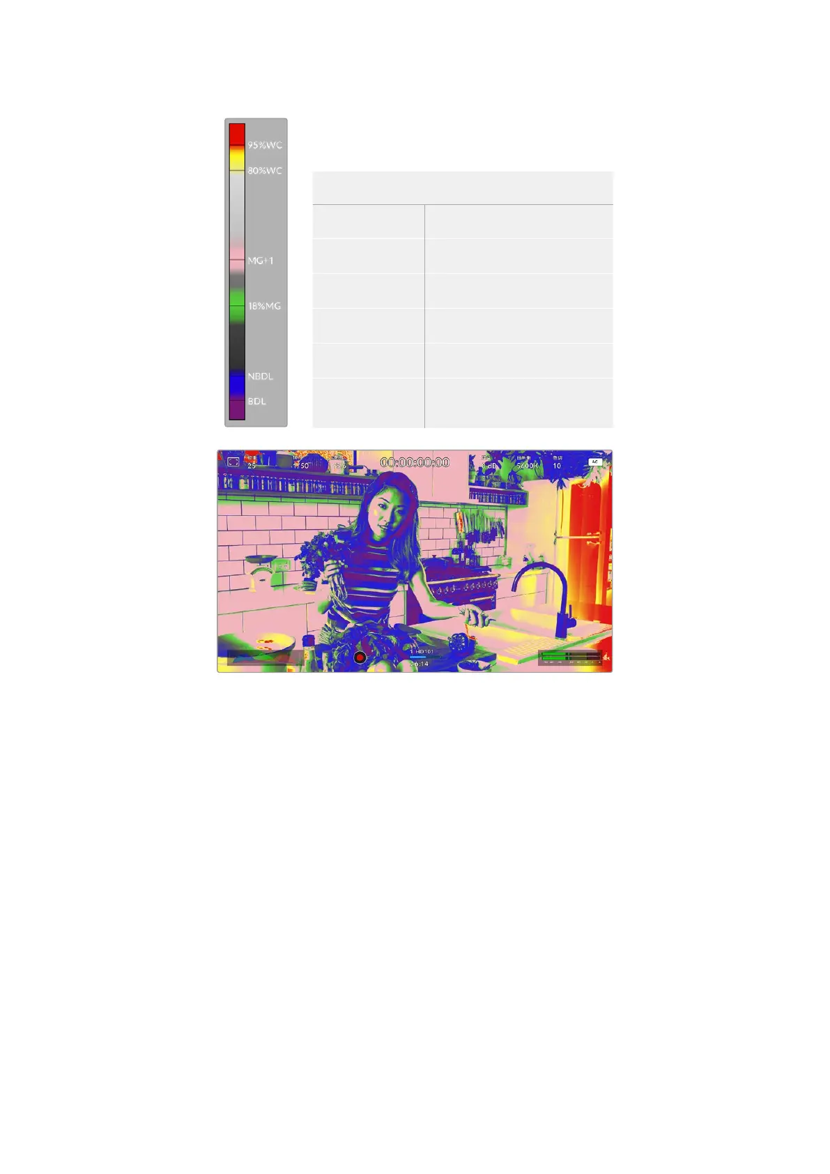 在一个曝光合理的画面中肤色调会用绿色和粉色伪色来表示。